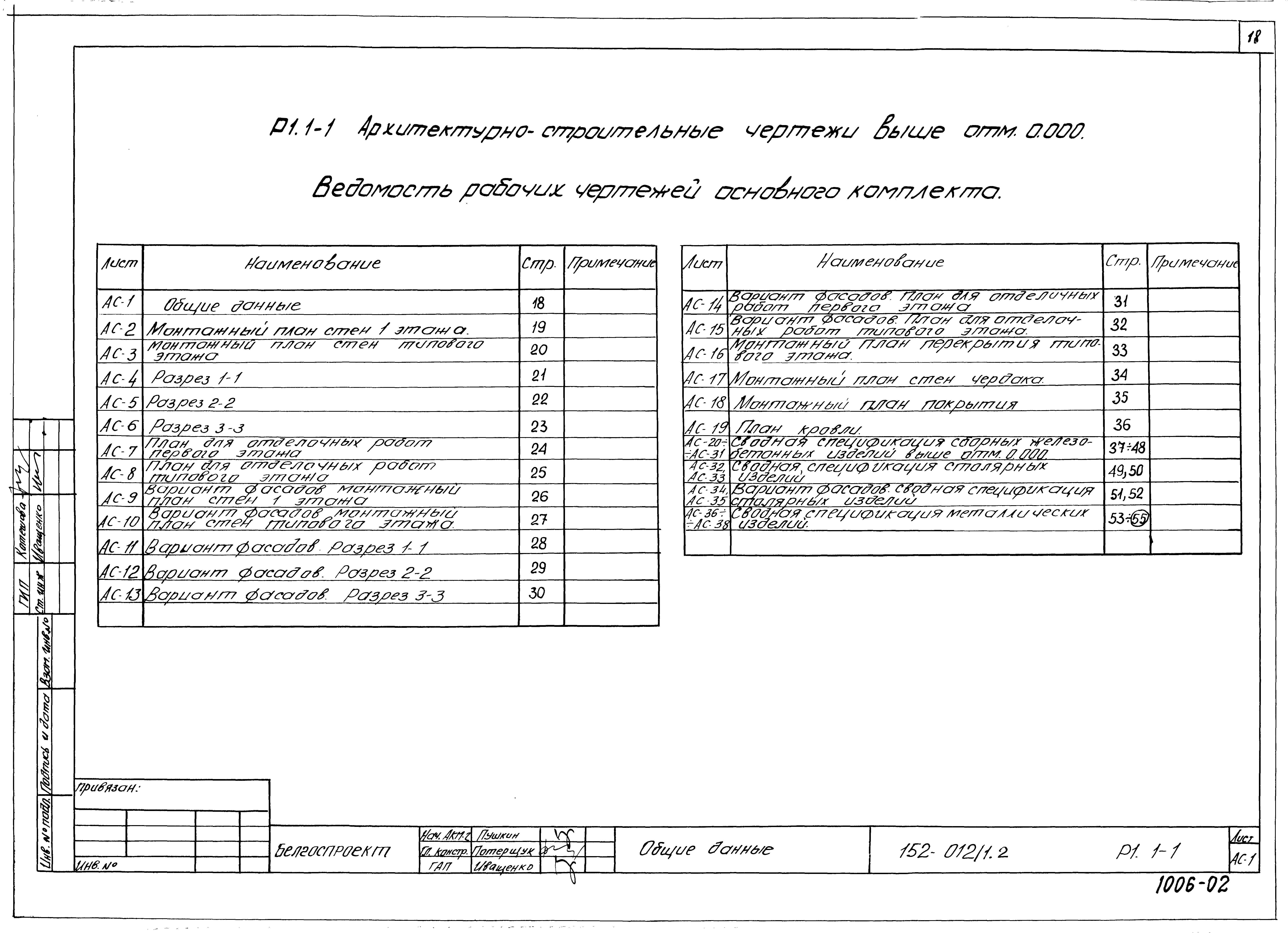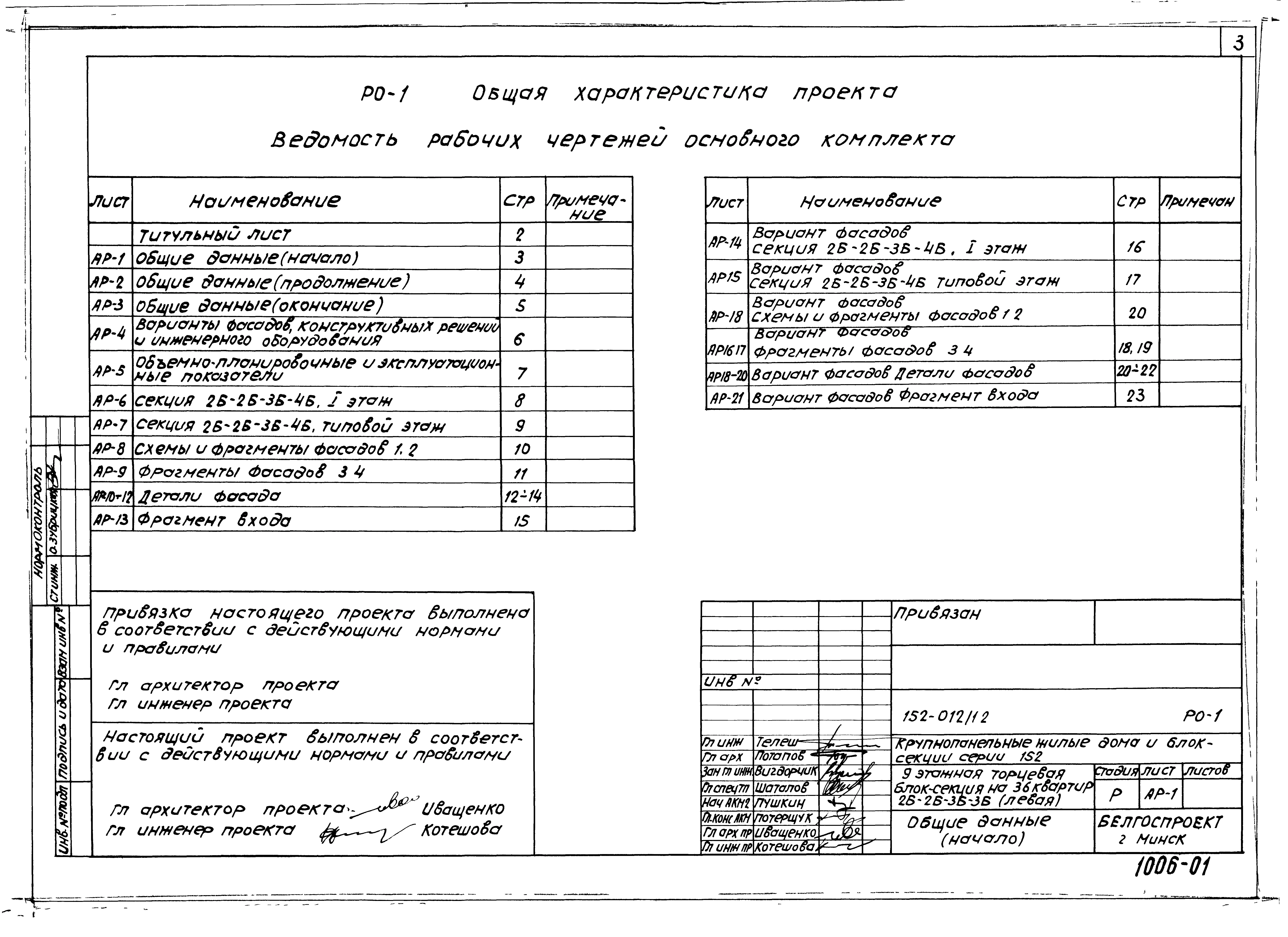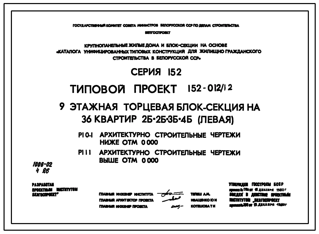 Типовой проект 152-012/1.2 9-этажная торцевая блок-секция на 36 квартир 2Б-2Б-3Б-4Б (левая). Паспорт проекта (формат PDF) Чертежи (формат TIF)