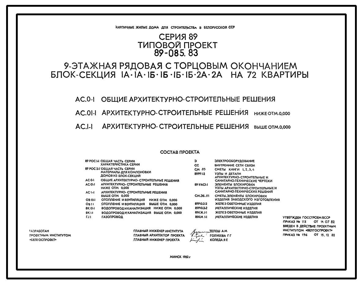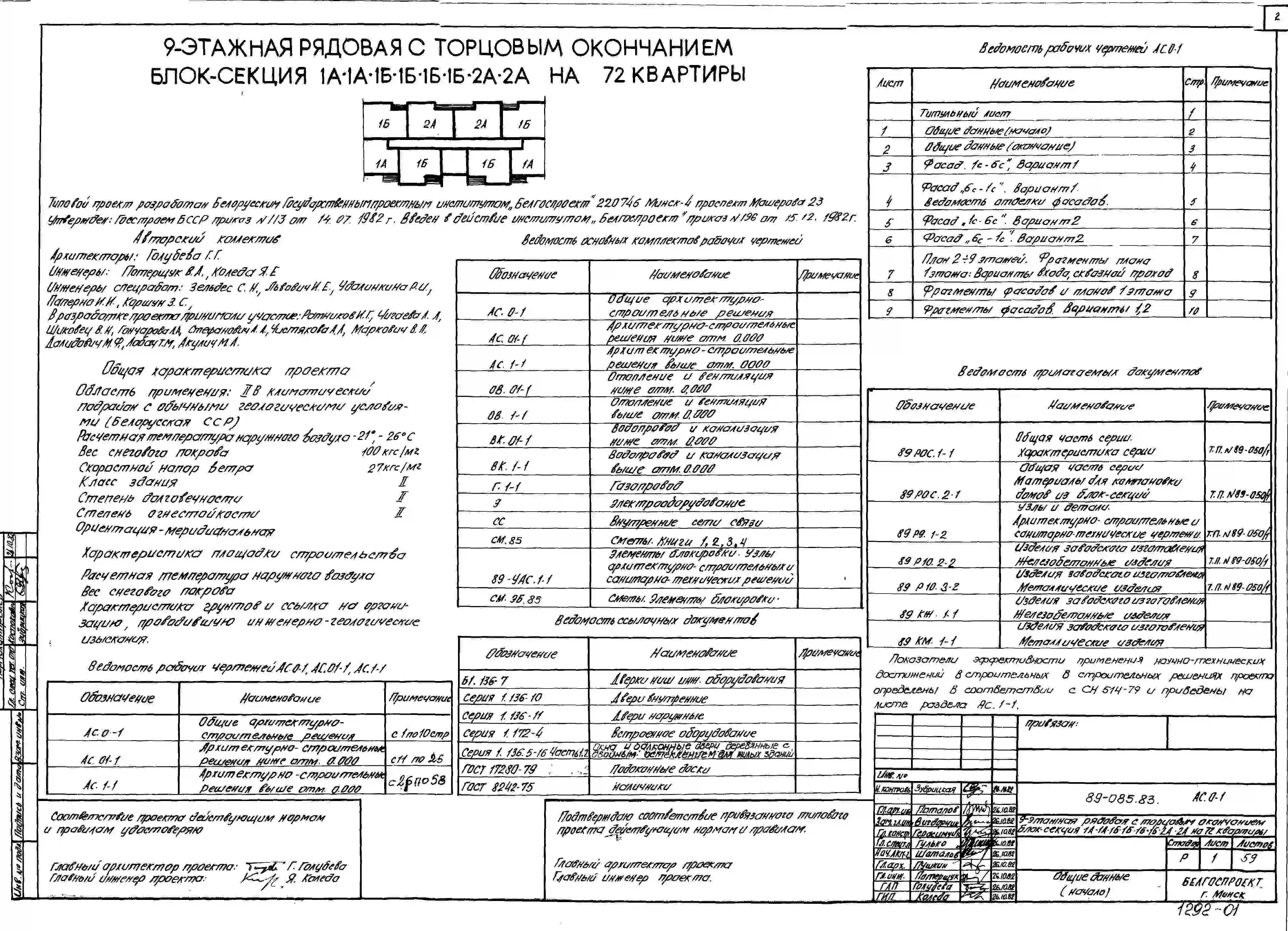 Типовой проект 89-085.83 Девятиэтажная рядовая с торцовым окончанием блок-секция 1А.1А.1Б.1Б.1Б.1Б.2А.2А. на 72 квартиры.