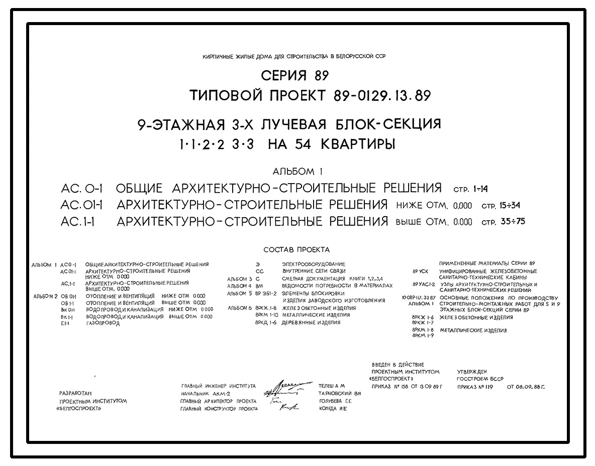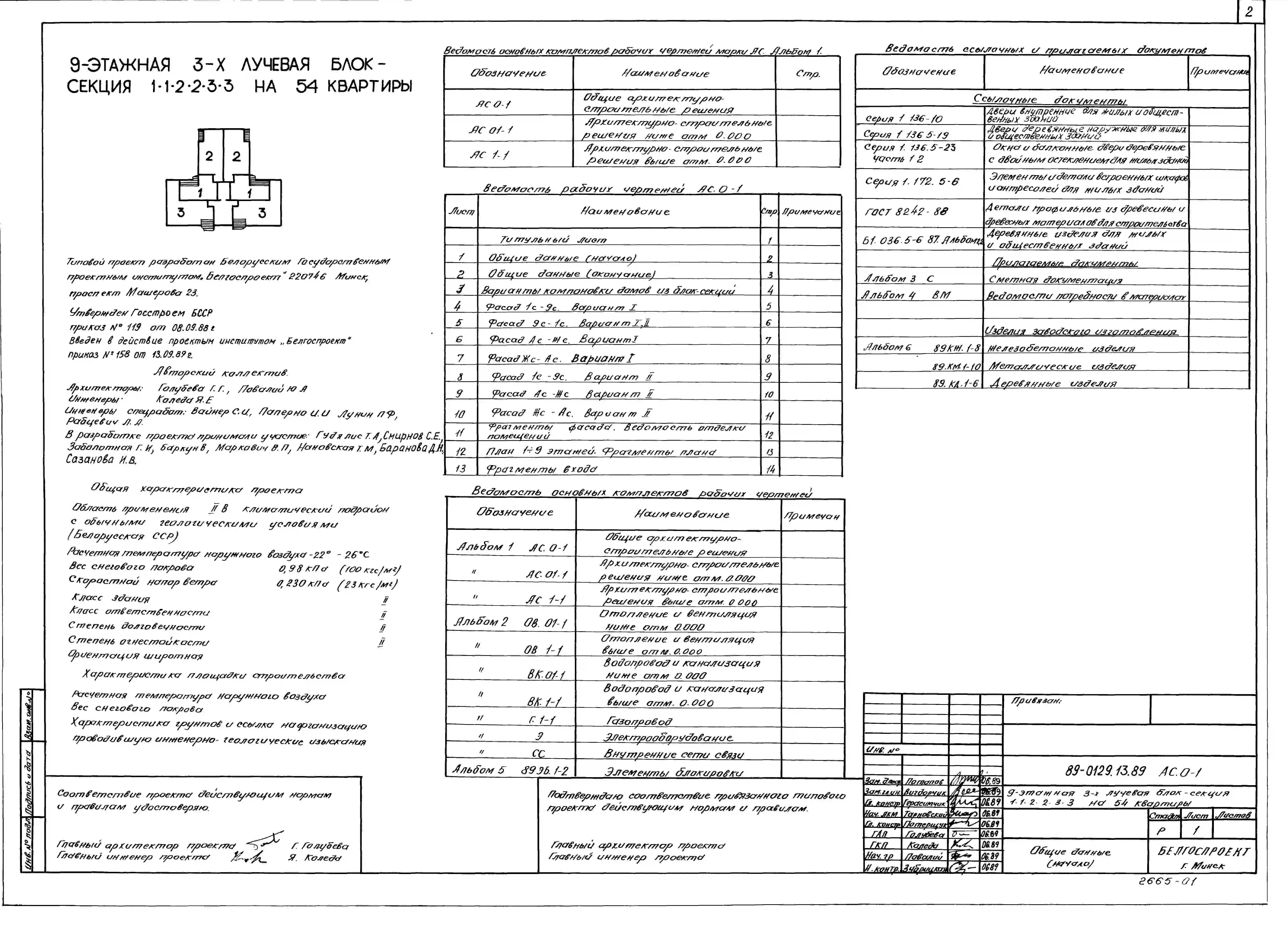 Типовой проект 89-0129.13.89 9-этажная 3-х лучевая блок-секция 1.1.2.2.3.3 на 54 квартиры (для строительства в БССР)