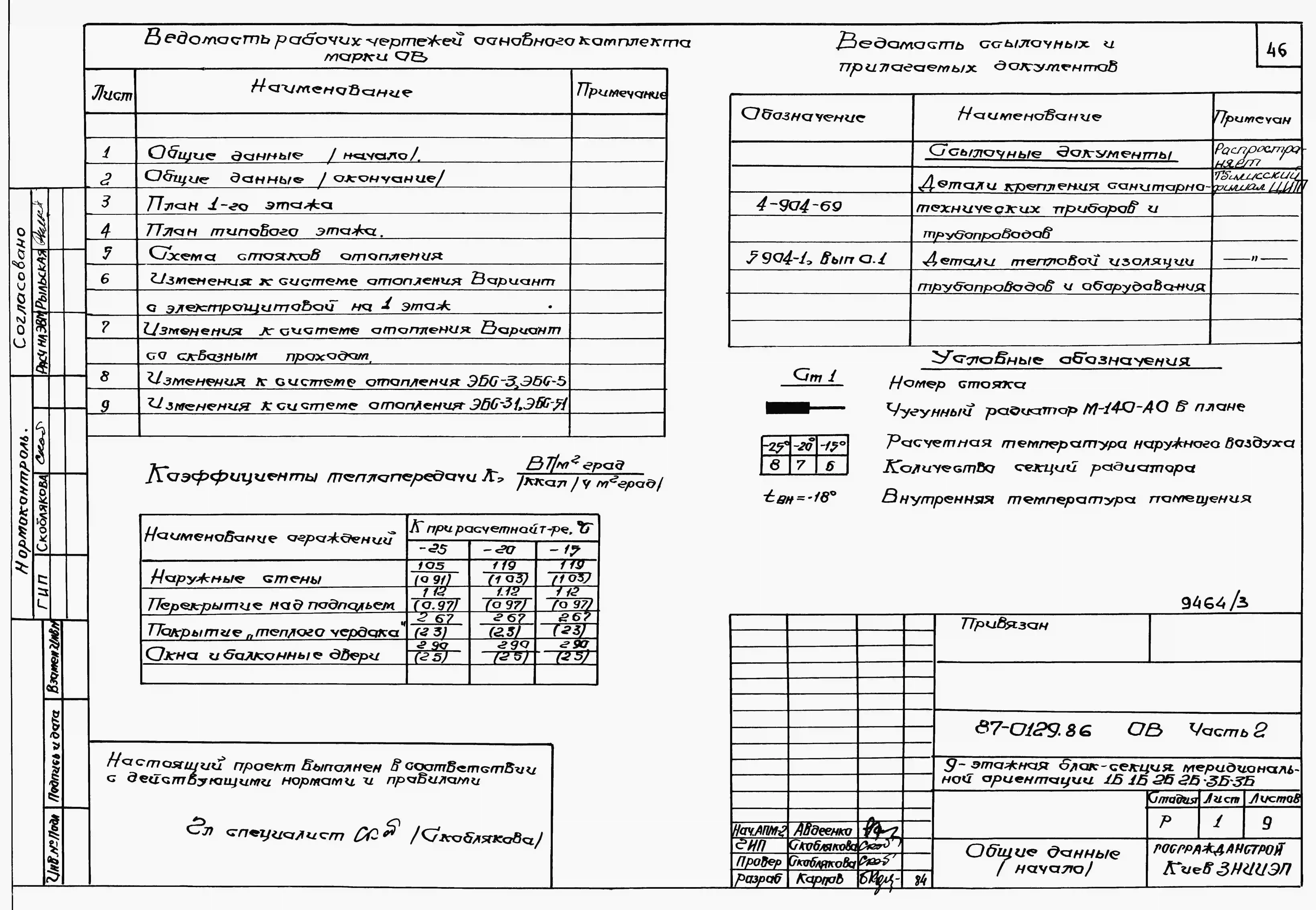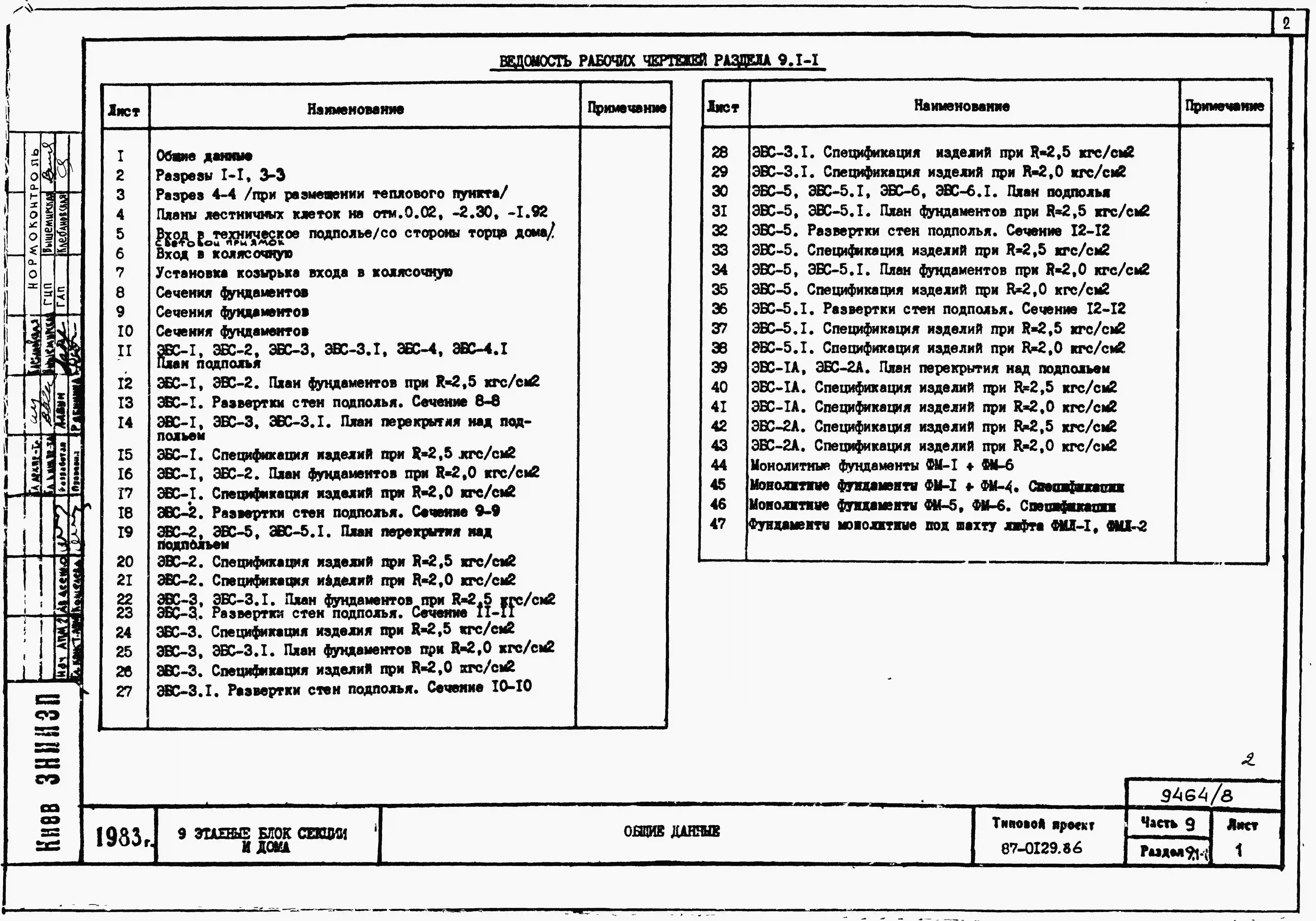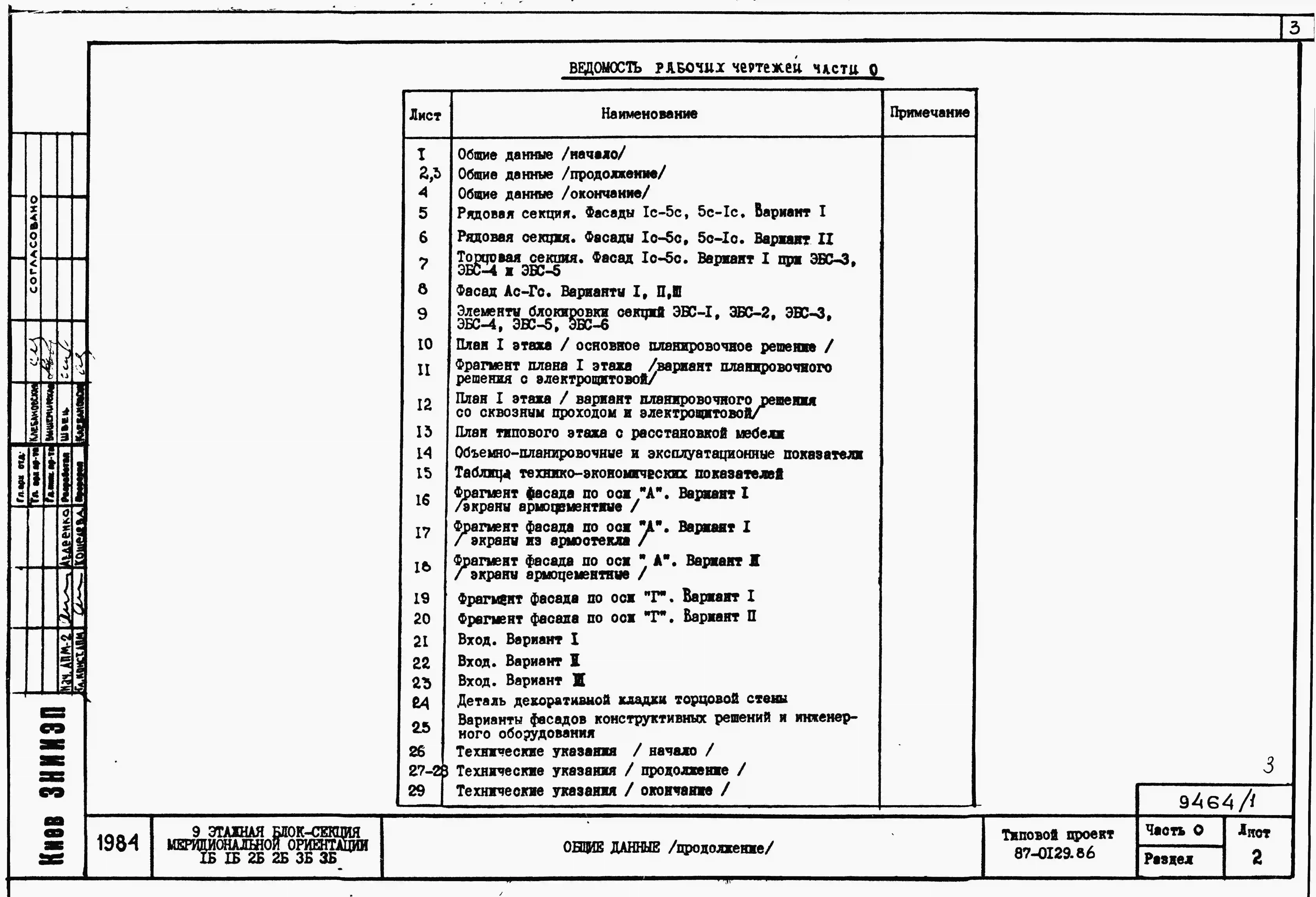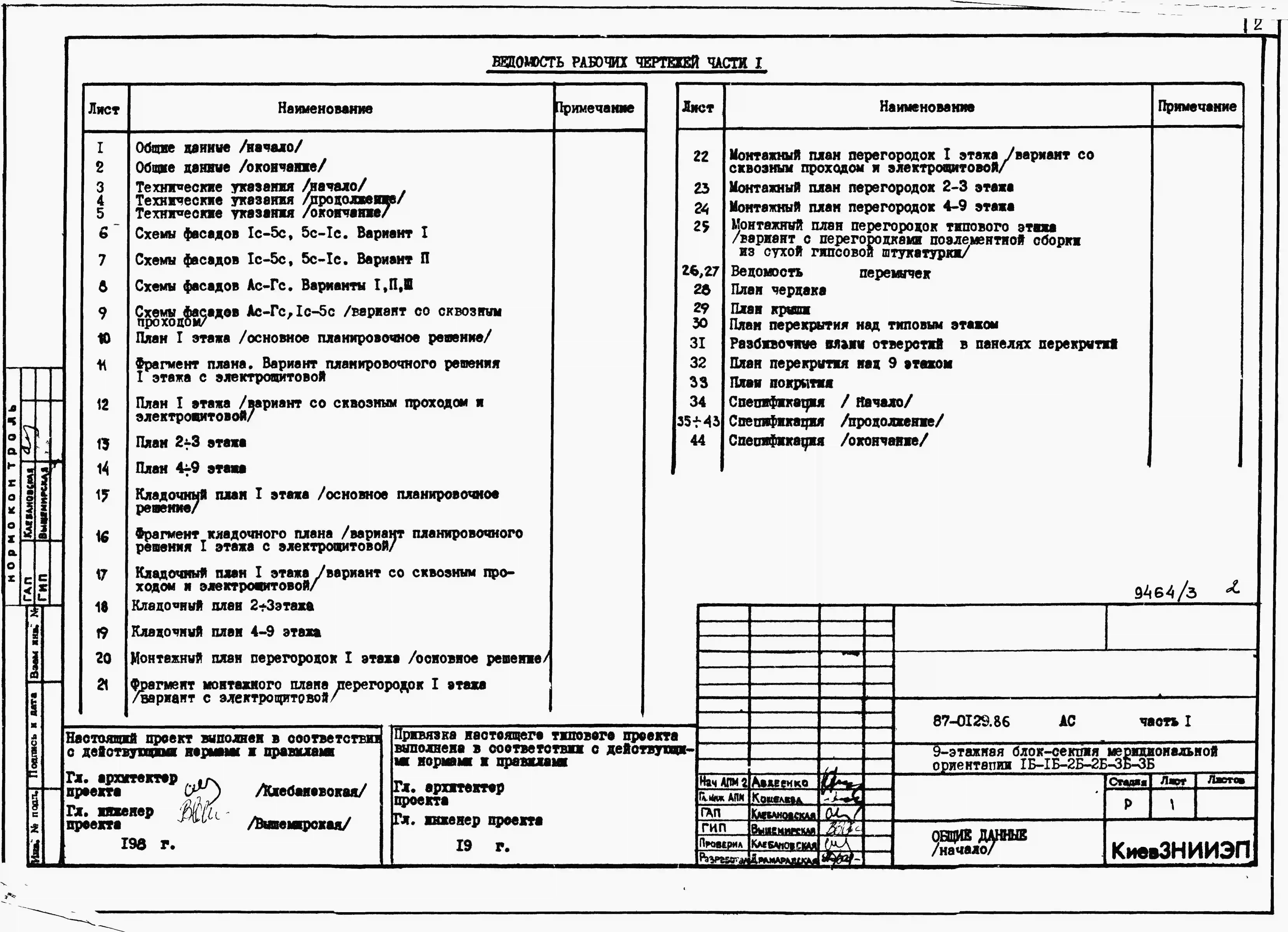Типовой проект 87-0129.86 Девятиэтажная блок-секция меридиальной ориентации на 54 квартиры 1Б-1Б-2Б-2Б-3Б-3Б