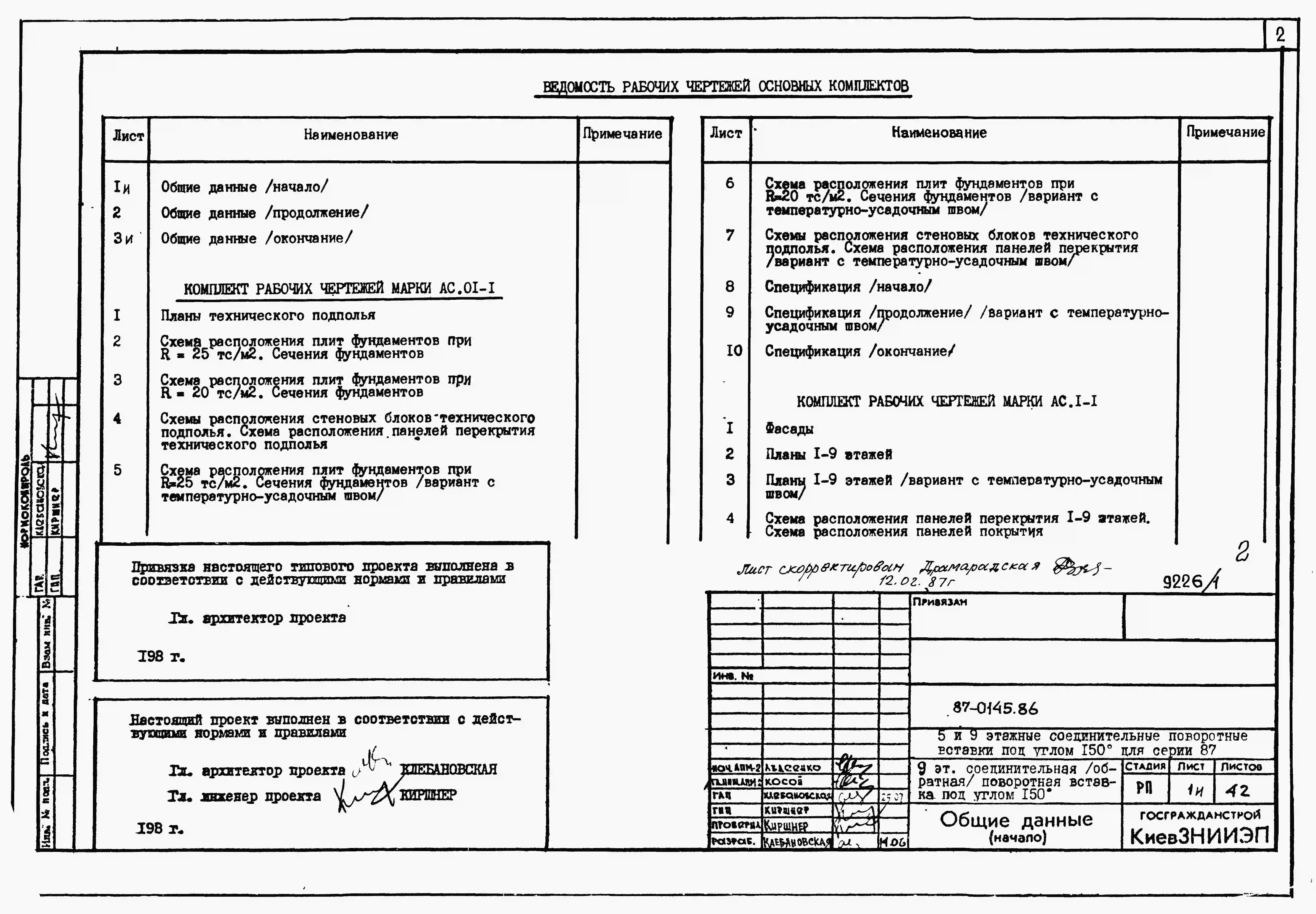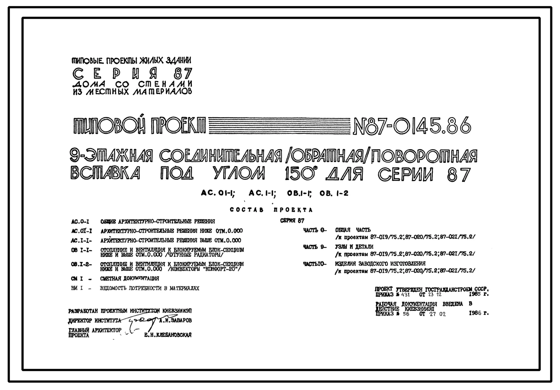 Типовой проект 87-0145.86 9-этажная соединительная /обратная/ поворотная вставка под углом 150о