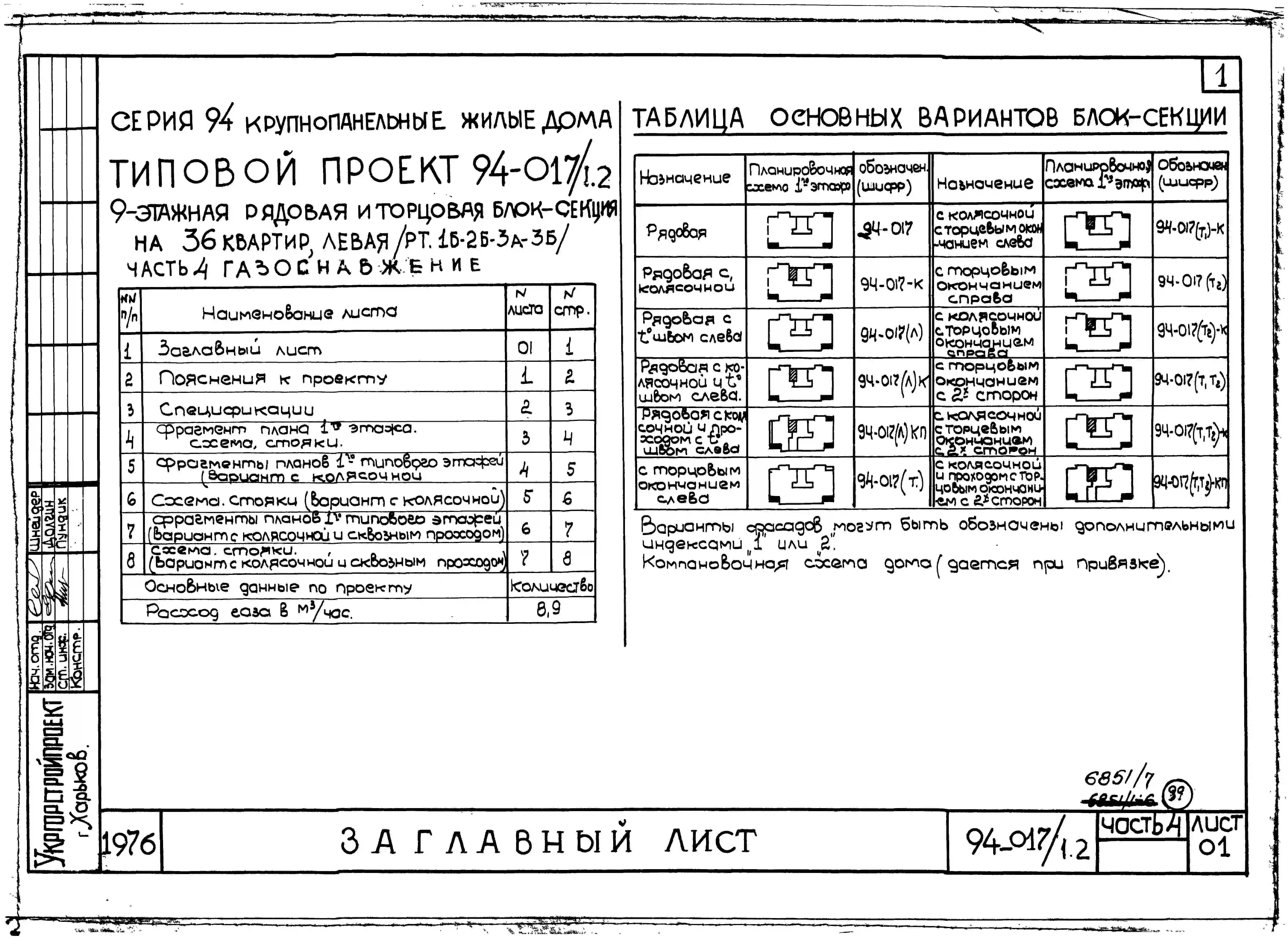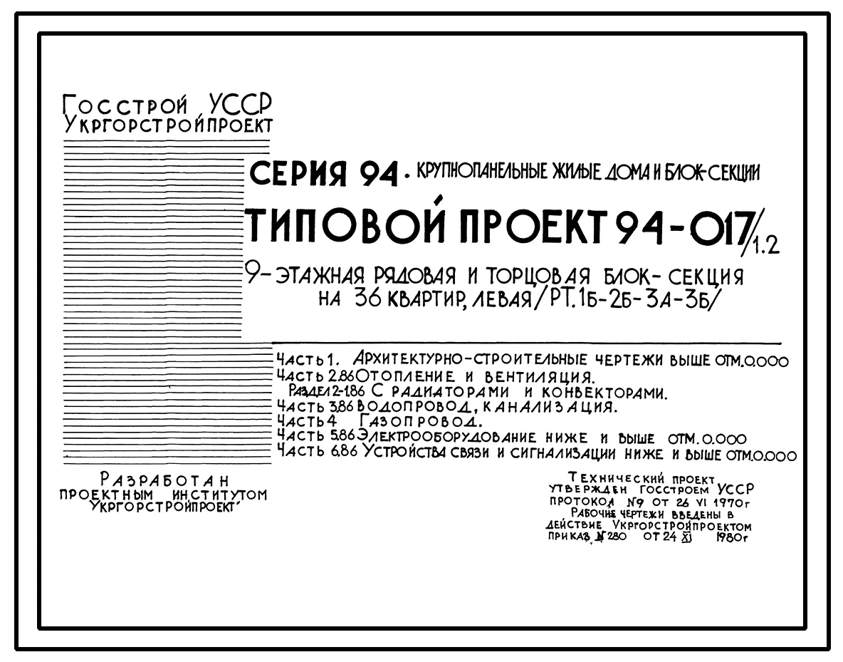 Типовой проект 94-017/1.2 Блок-секция 9-этажная 36-квартирная рядовая с торцовыми окончаниями, левая 1Б-2Б-3А-3Б