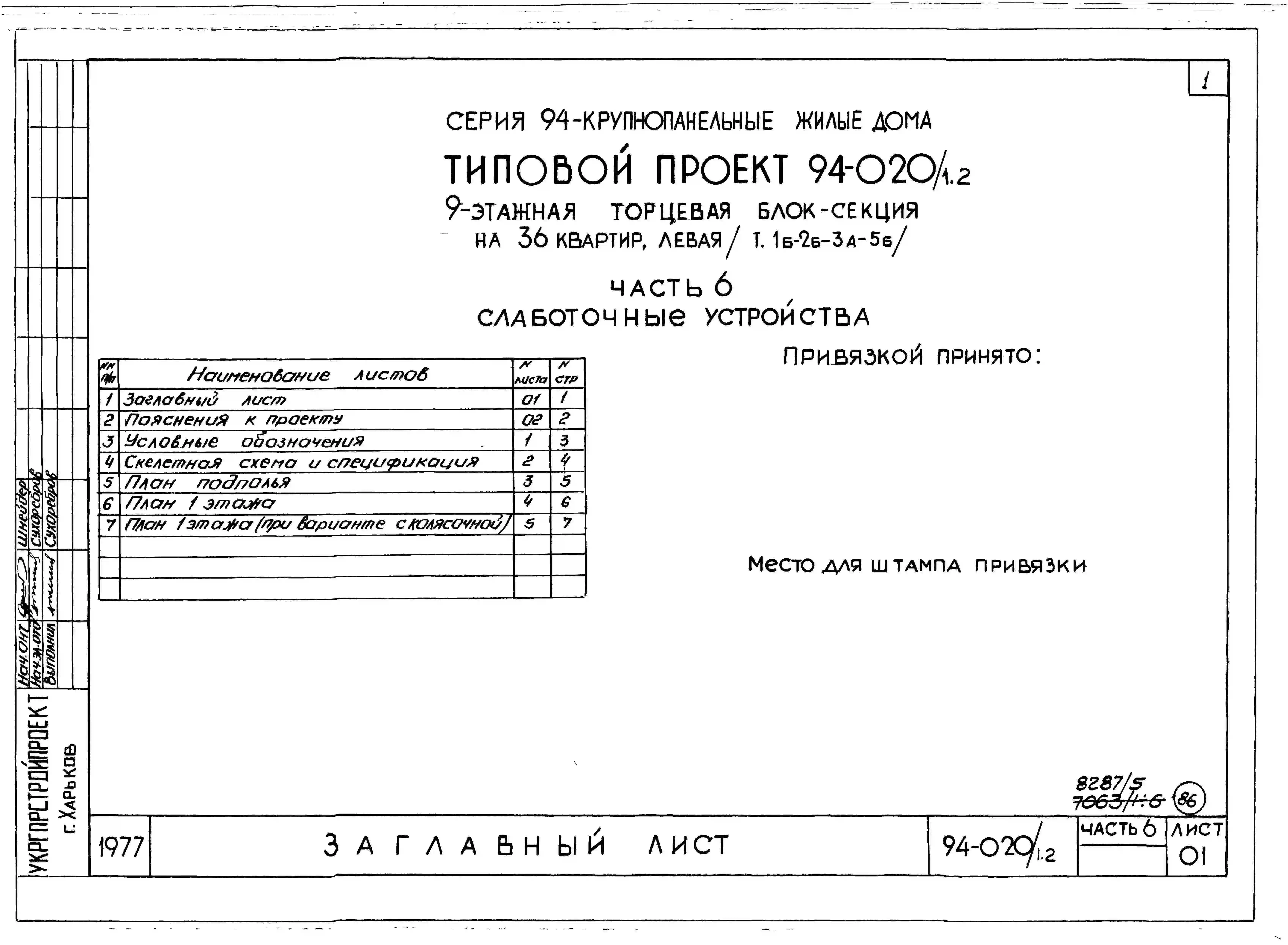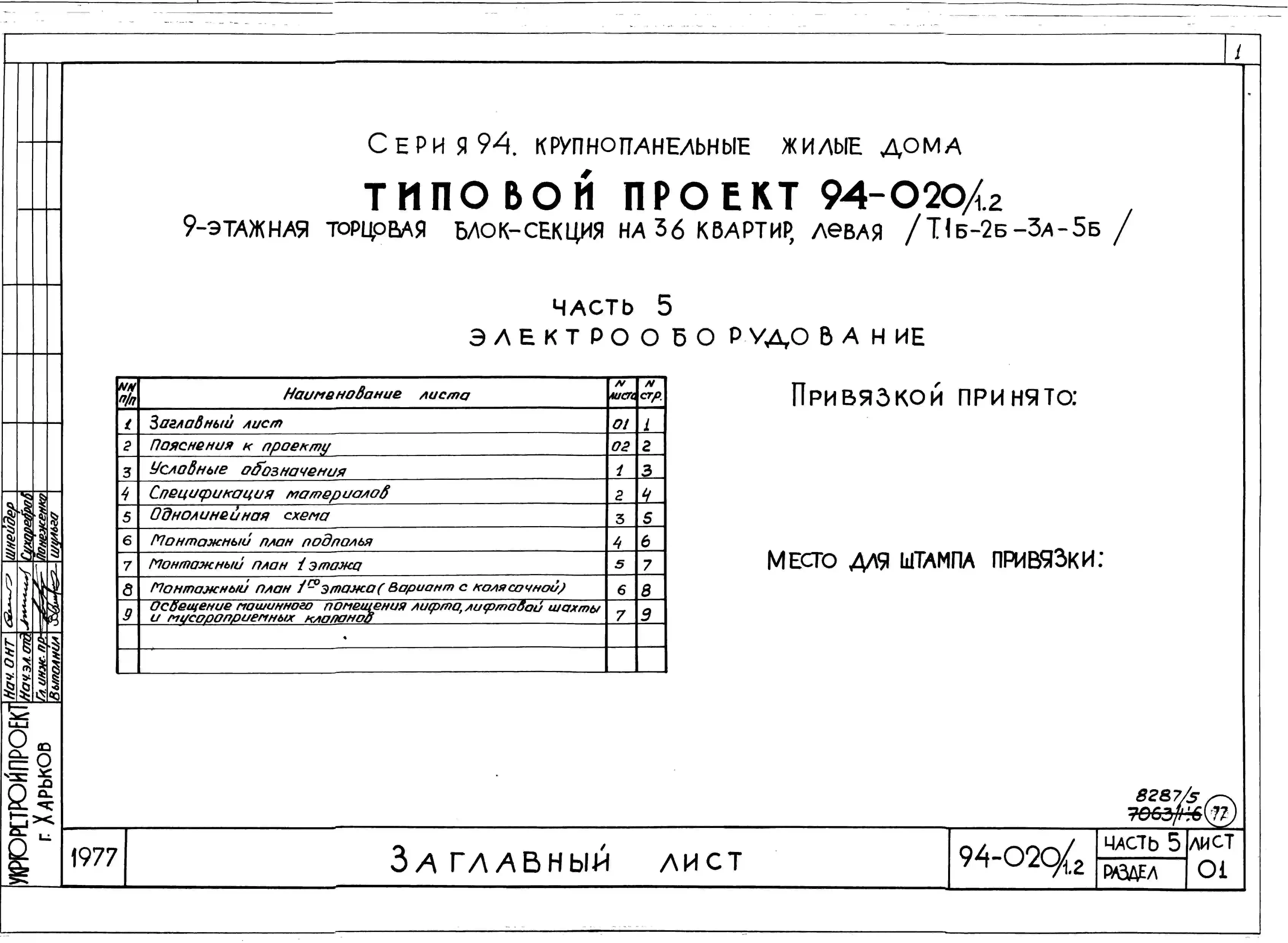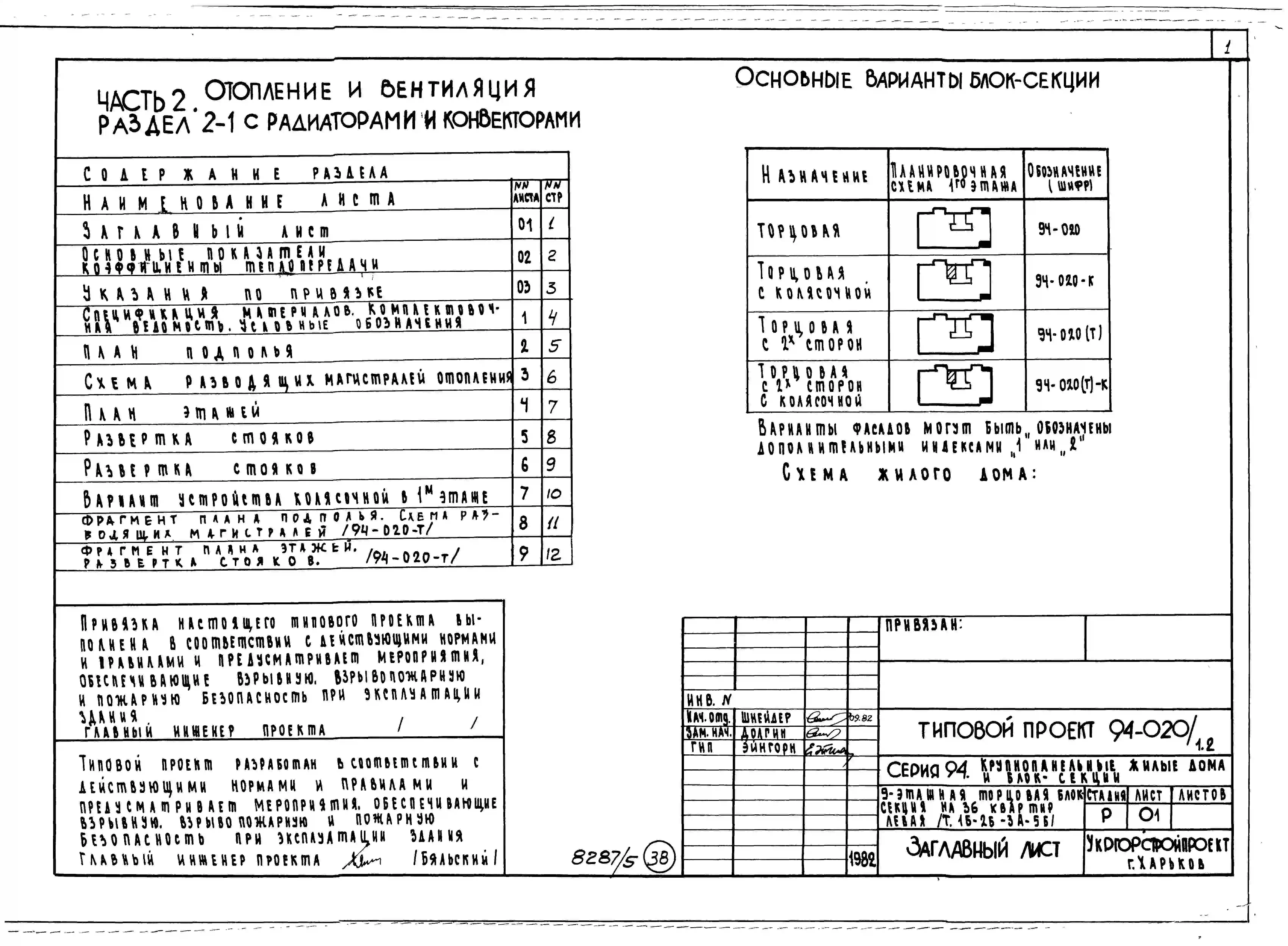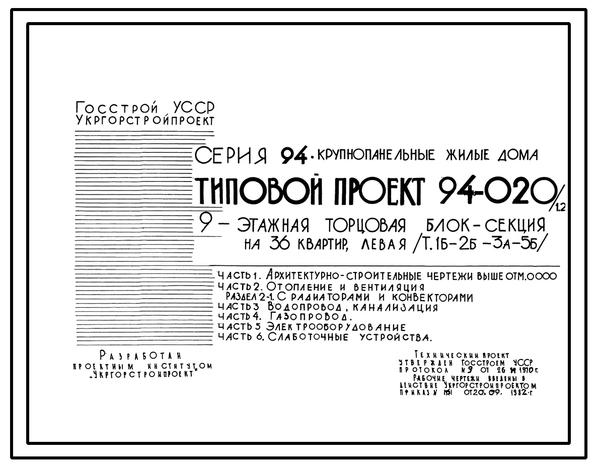 Типовой проект 94-020/1.2 9-этажная торцовая блок-секция на 36 квартир, левая 1Б-2Б-3А-5Б. Паспорт проекта (формат PDF) Чертежи (формат TIF)