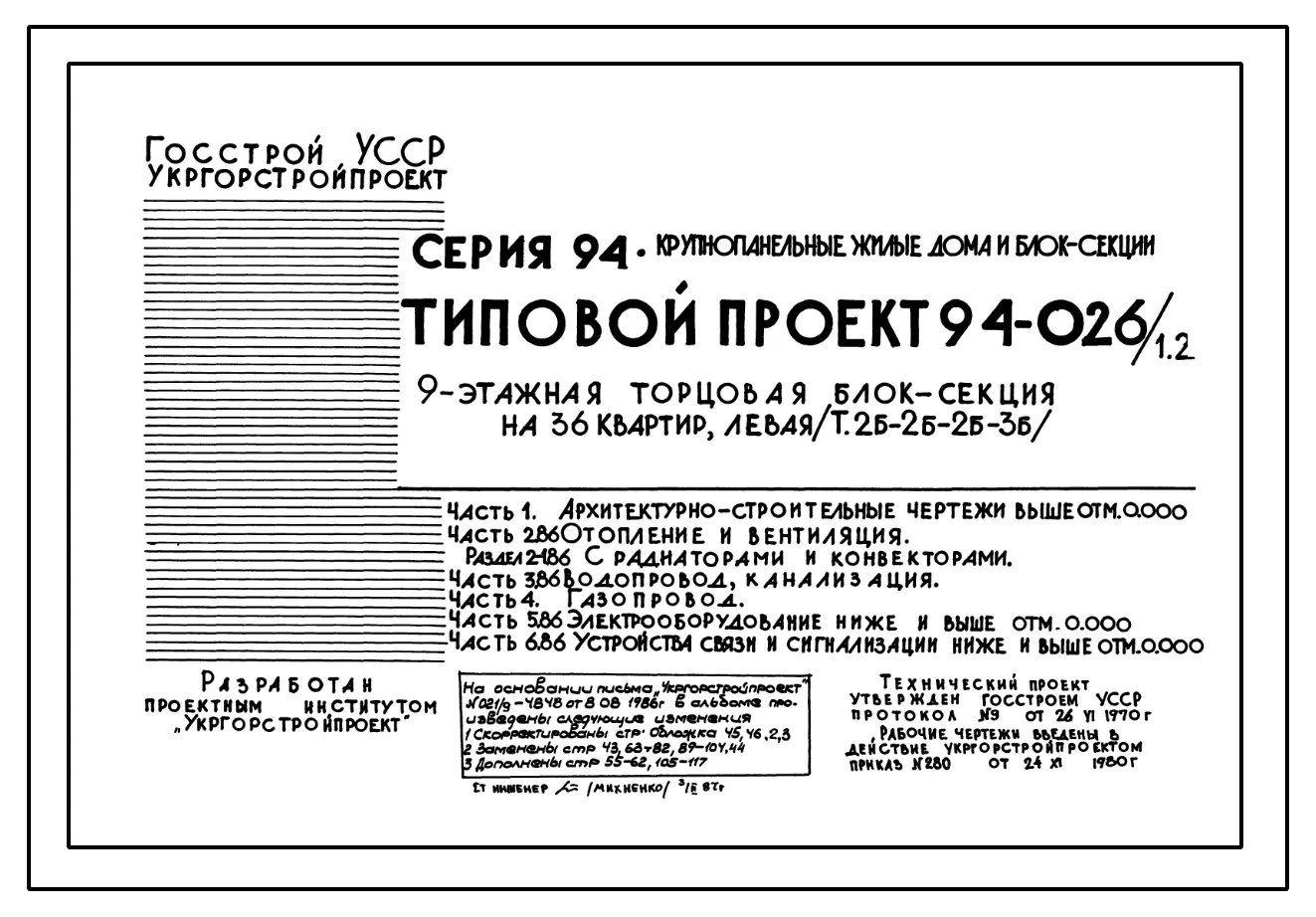 Типовой проект 94-026/1.2 Блок-секция 9-этажная 36-квартирная рядовая с торцовая, левая 2Б-2Б-2Б-3Б