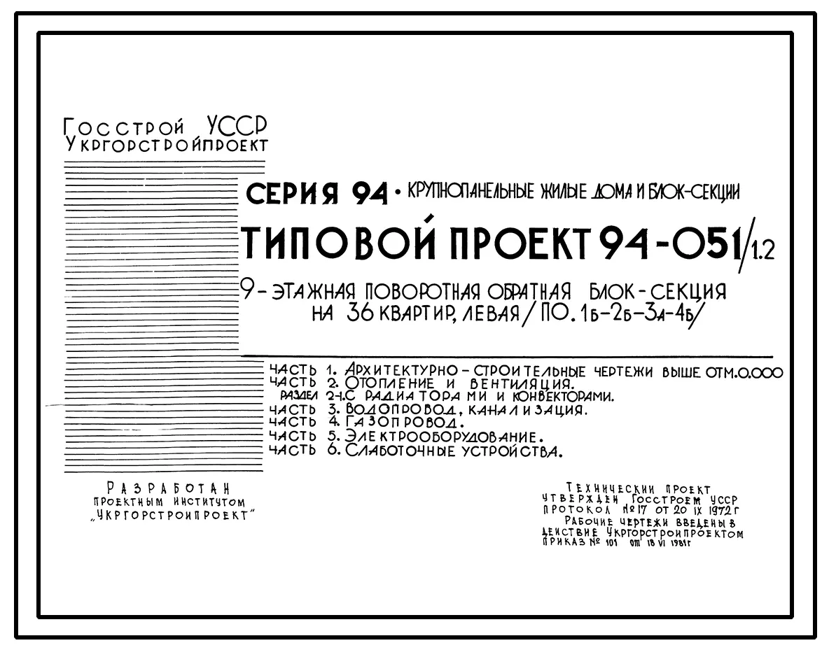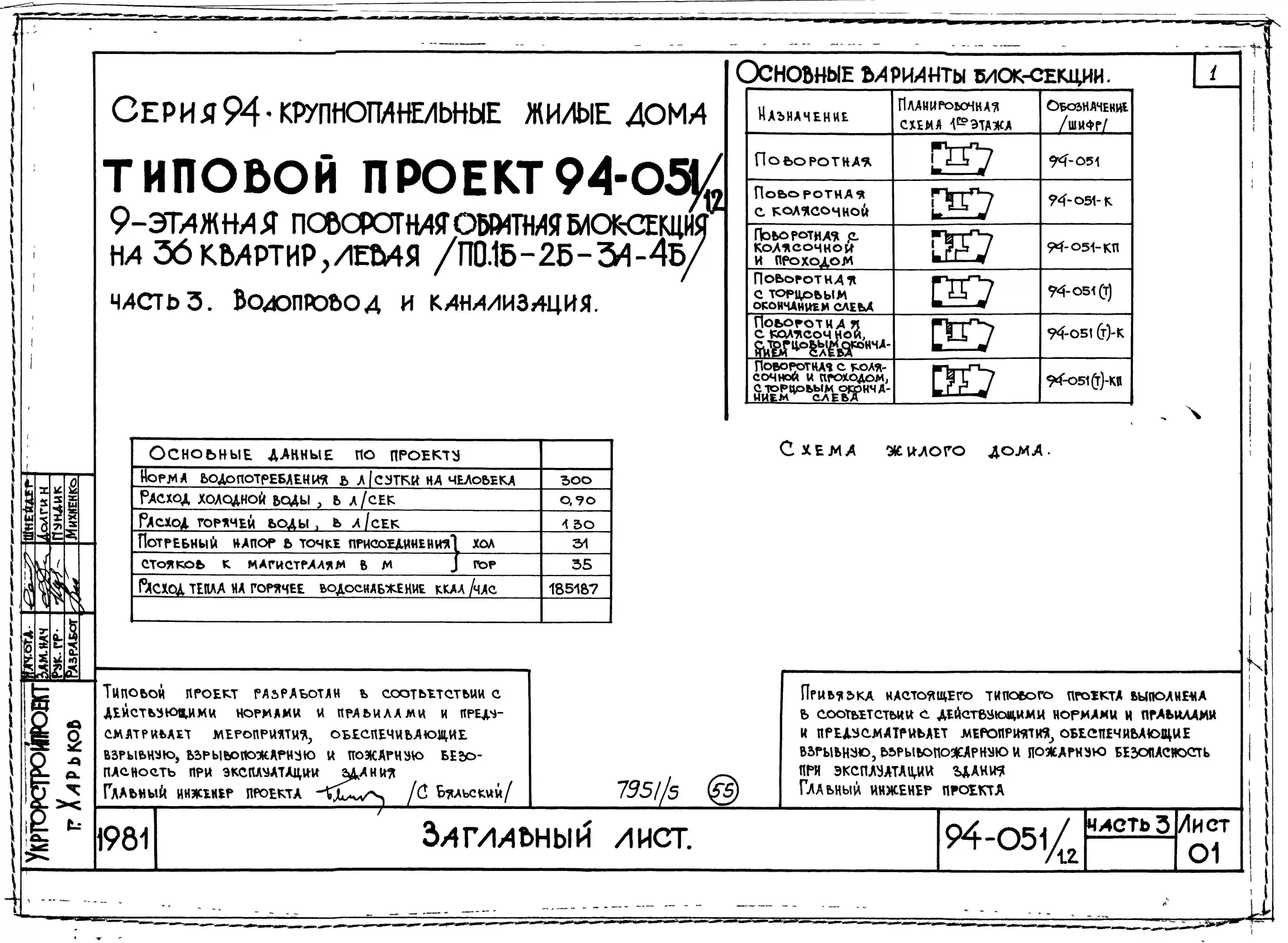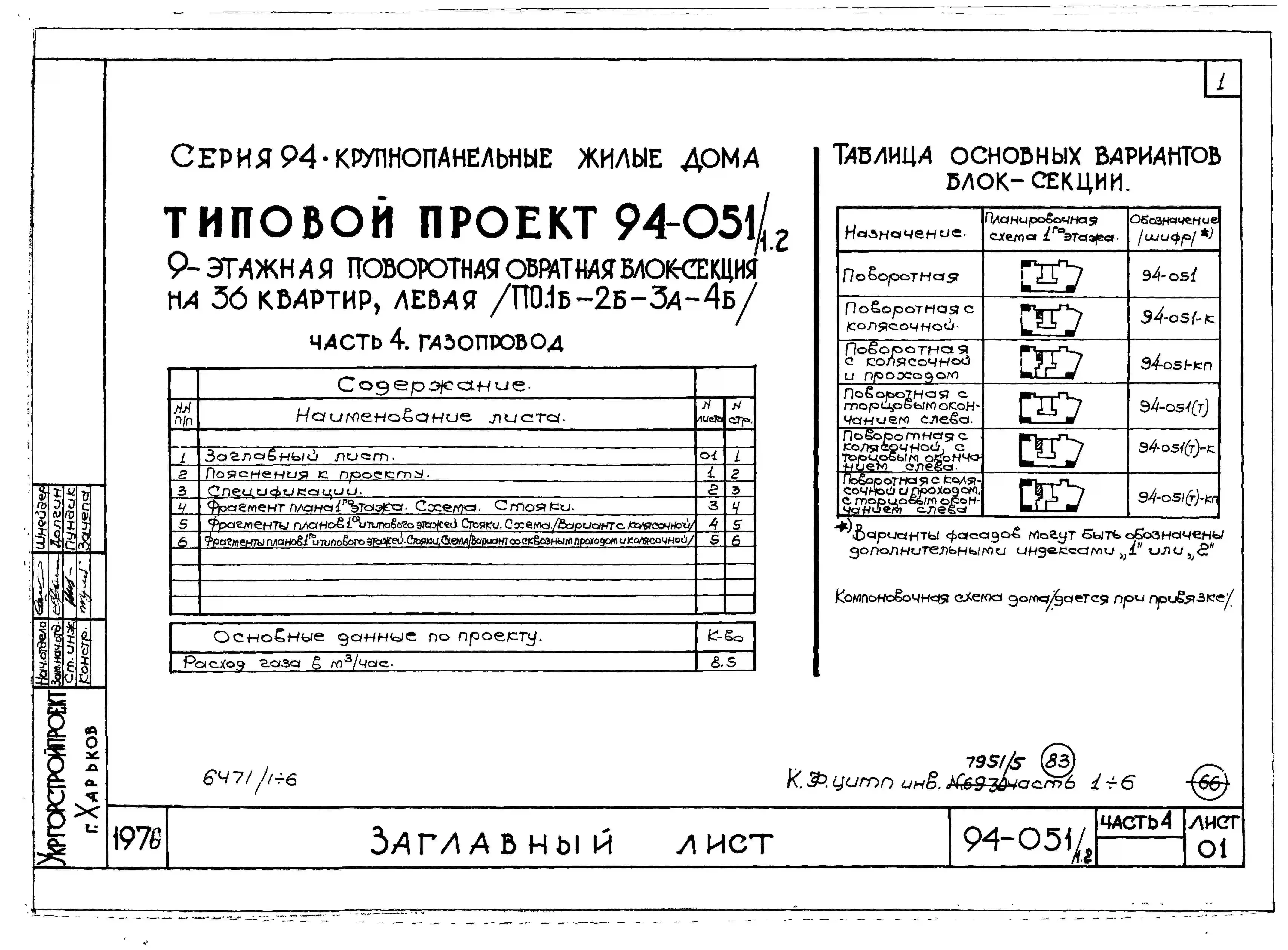 Типовой проект 94-051/1.2 Блок-секция поворотная обратная левая 9-этажная 36-квартирная 1Б-2Б-3А-4Б