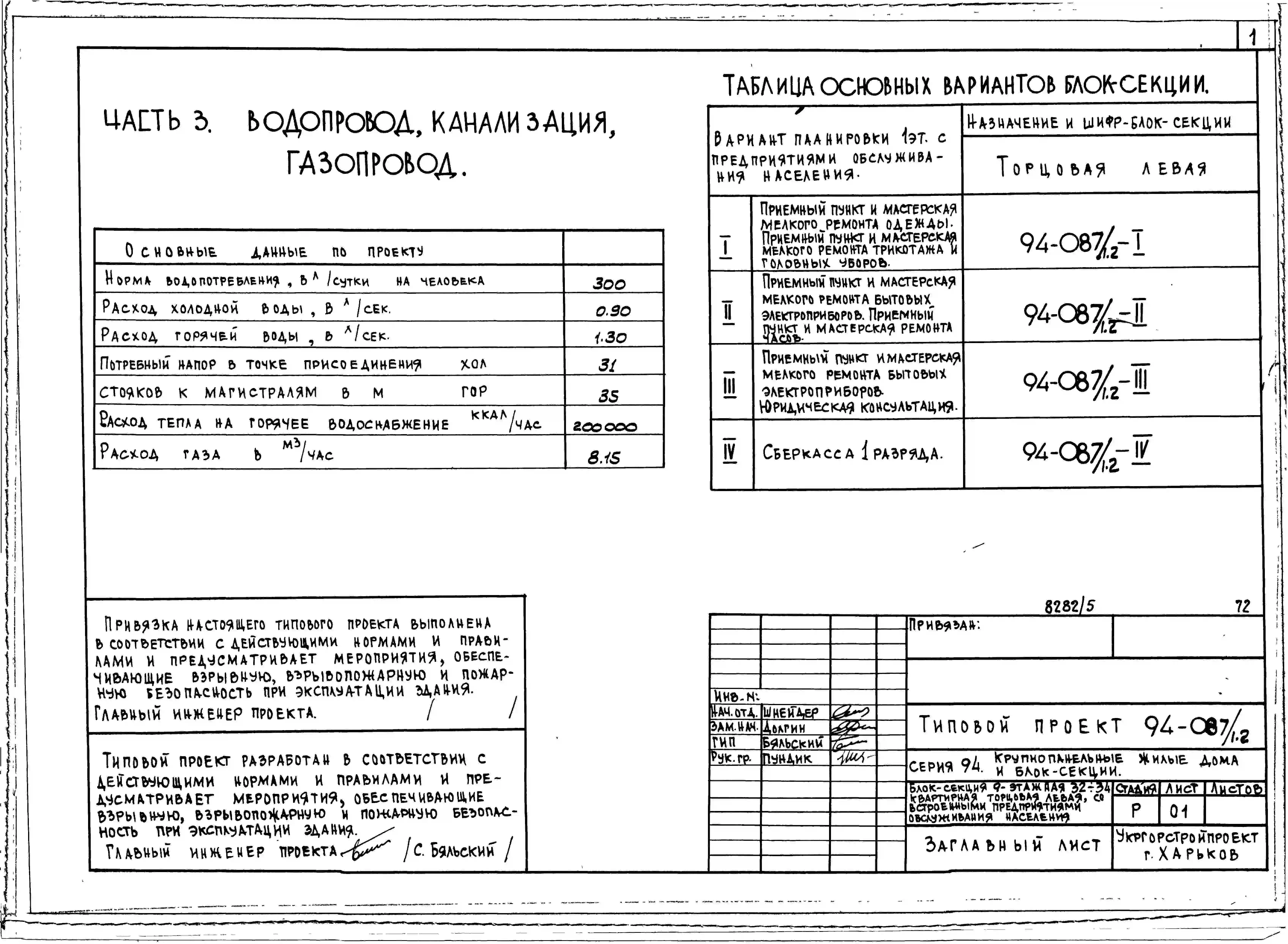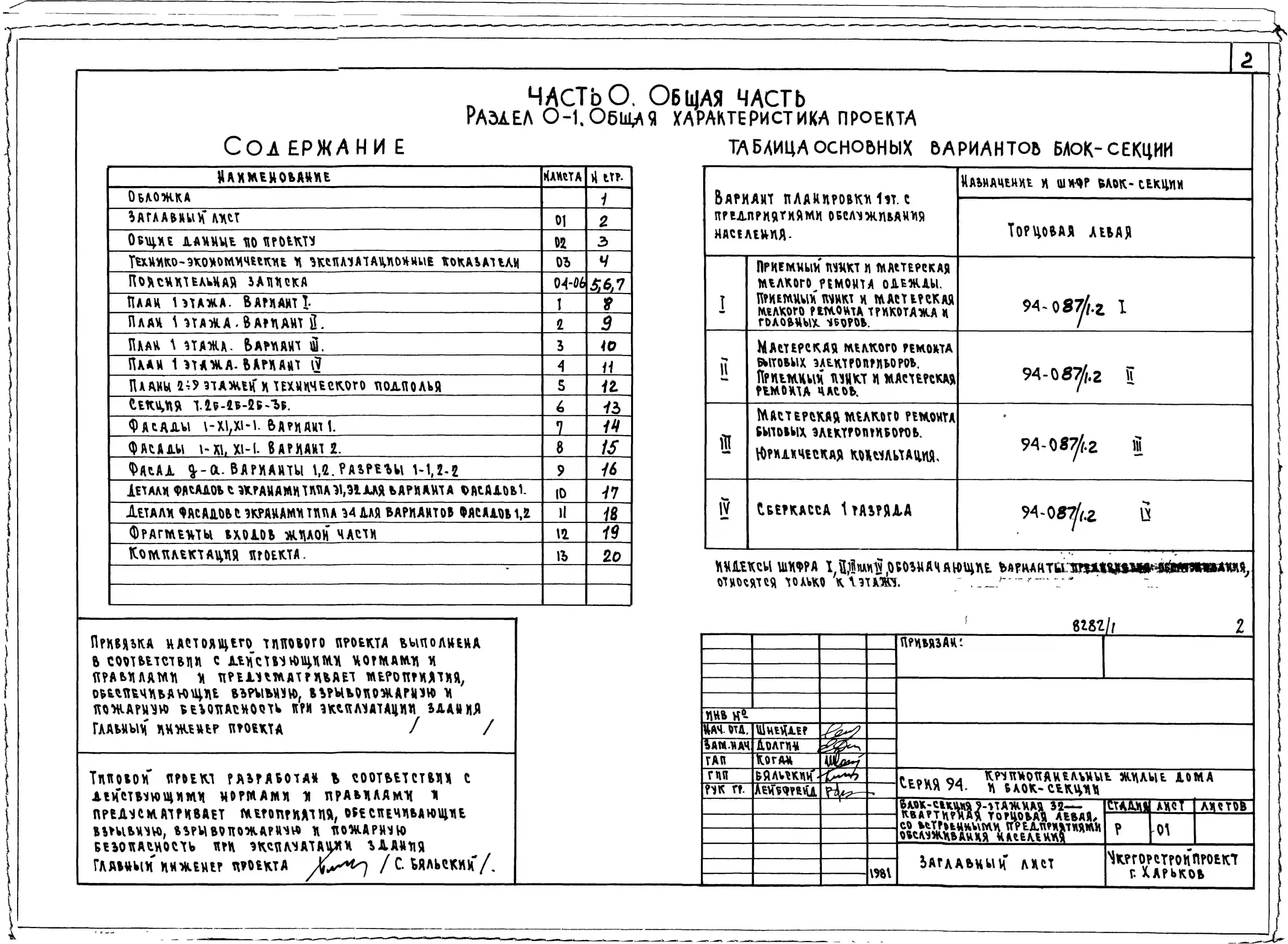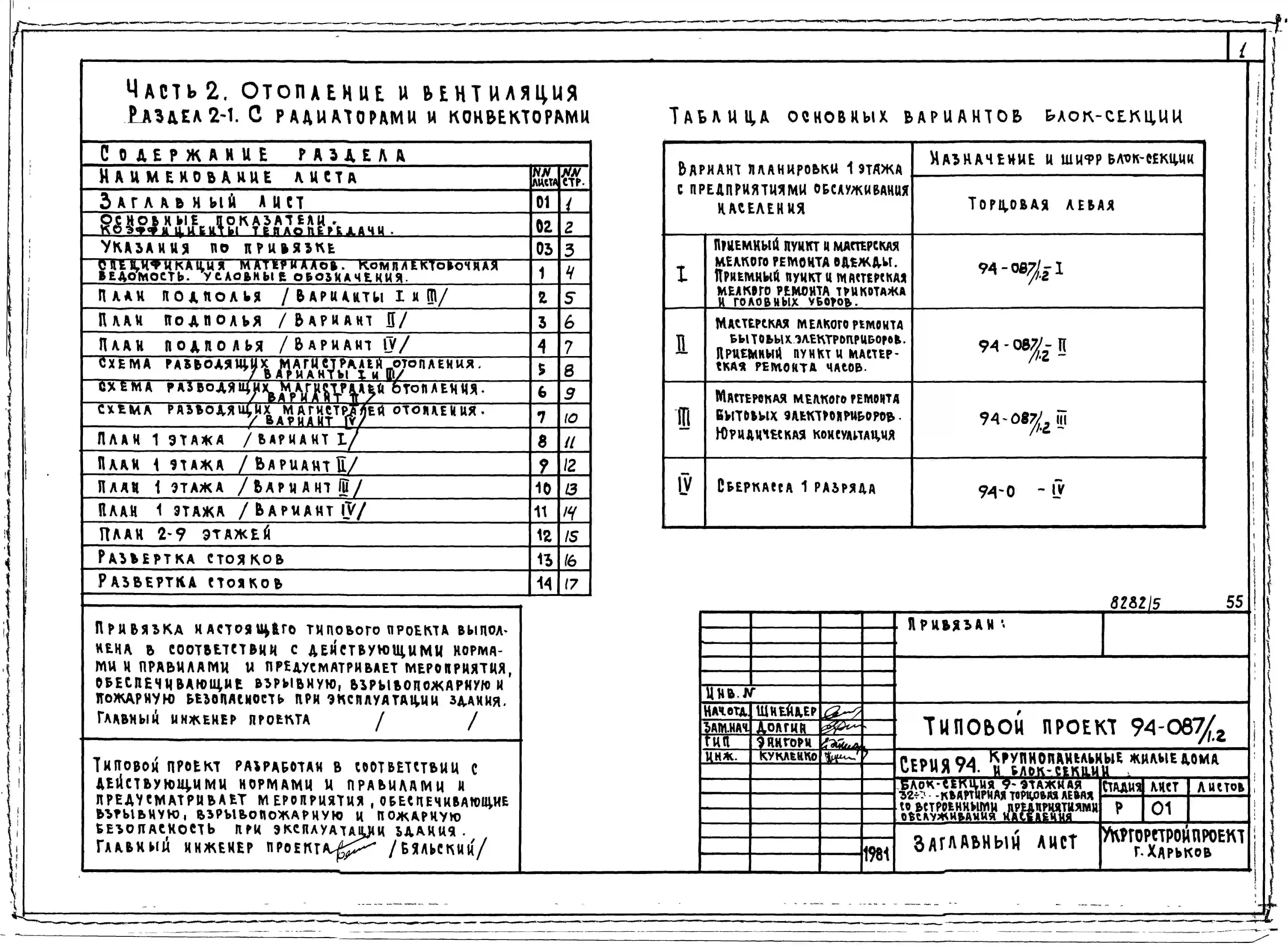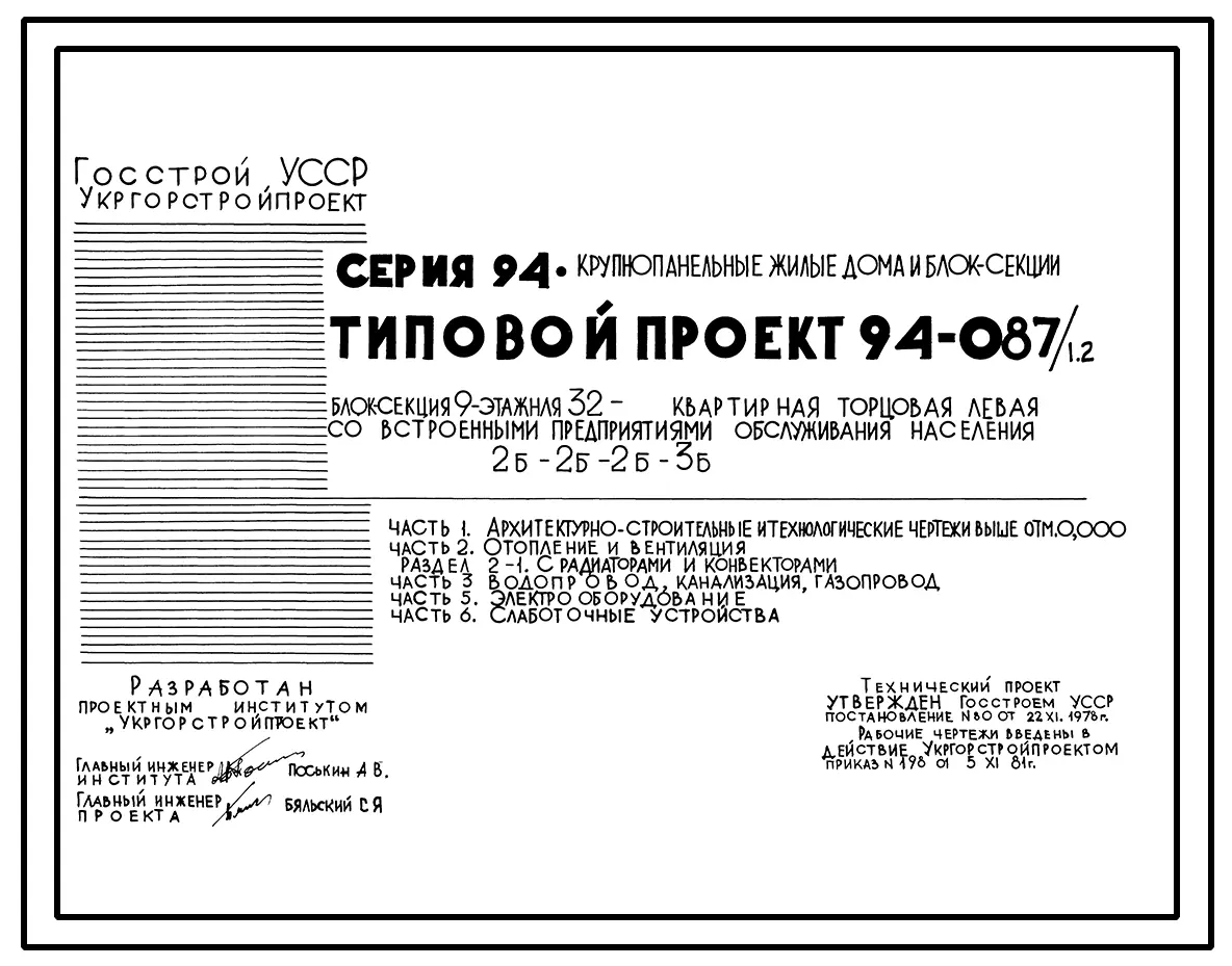 Типовой проект 94-087/1.2 Блок-секция 9-этажная 32-квартирная торцовая, левая со встроенными предприятиями обслуживания населения 2Б-2Б-2Б-3Б