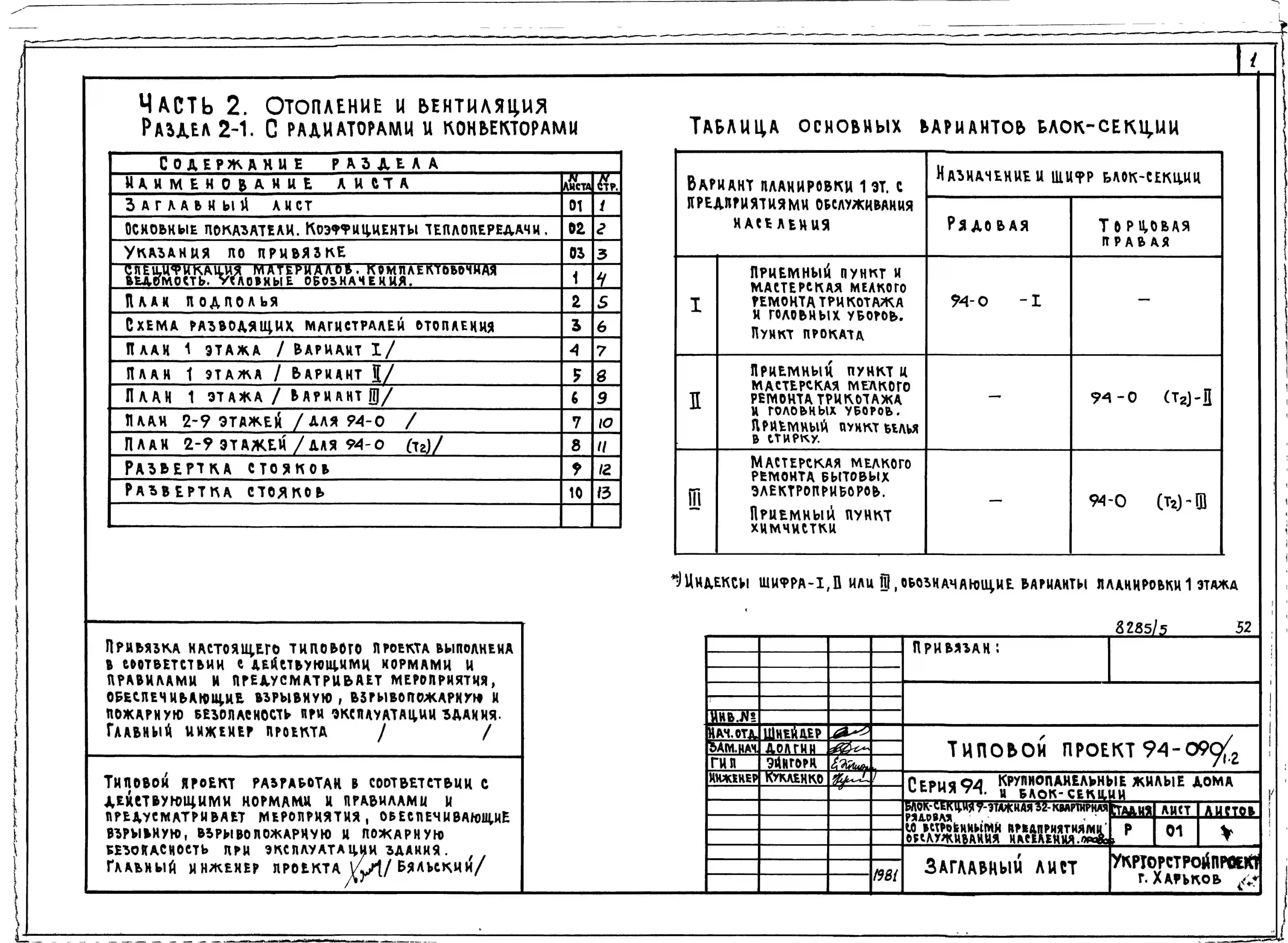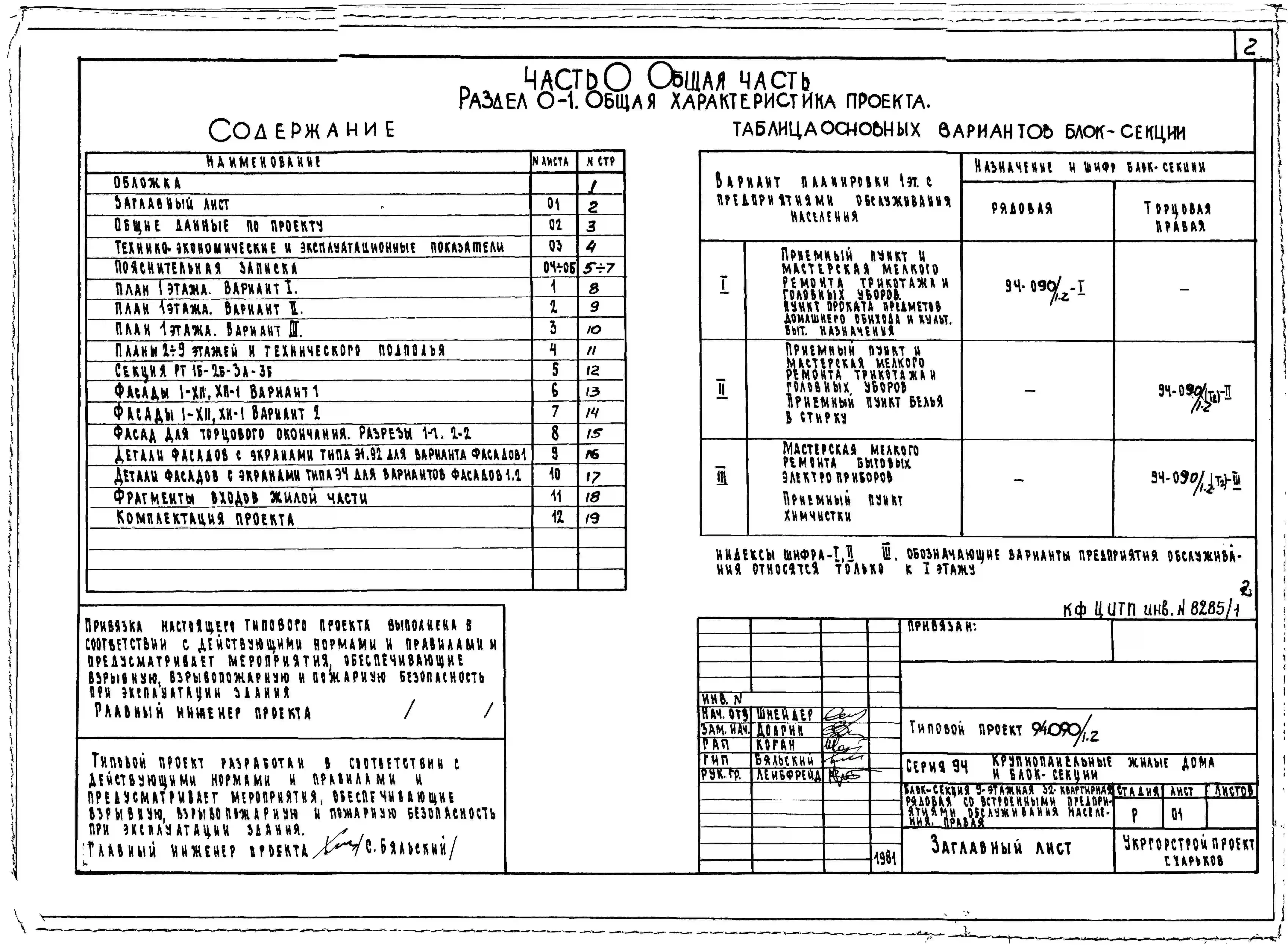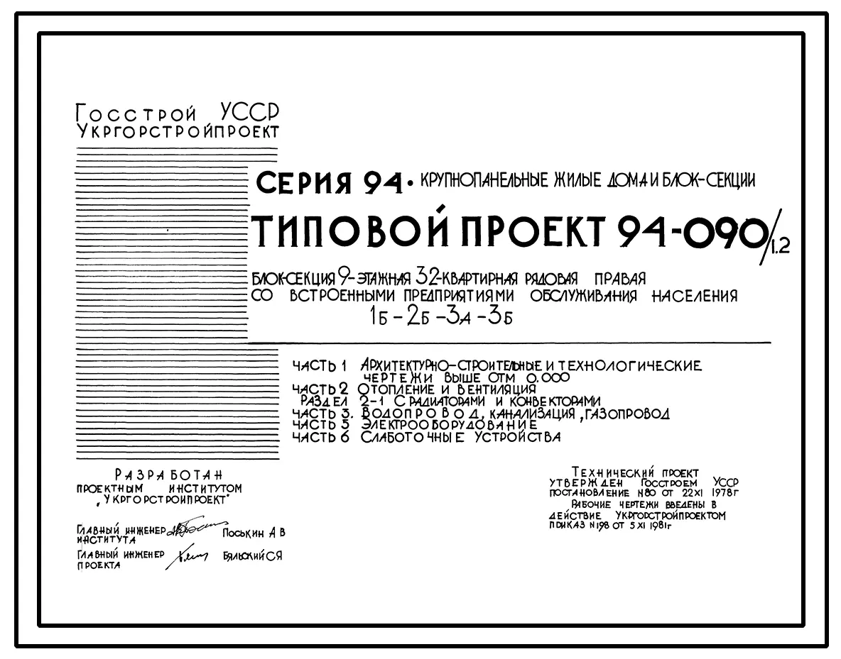 Типовой проект 94-090/1.2 Блок-секция 9-этажная 32-квартирная рядовая правая со встроенными предприятиями обслуживания населения 1Б-2Б-3А-3Б