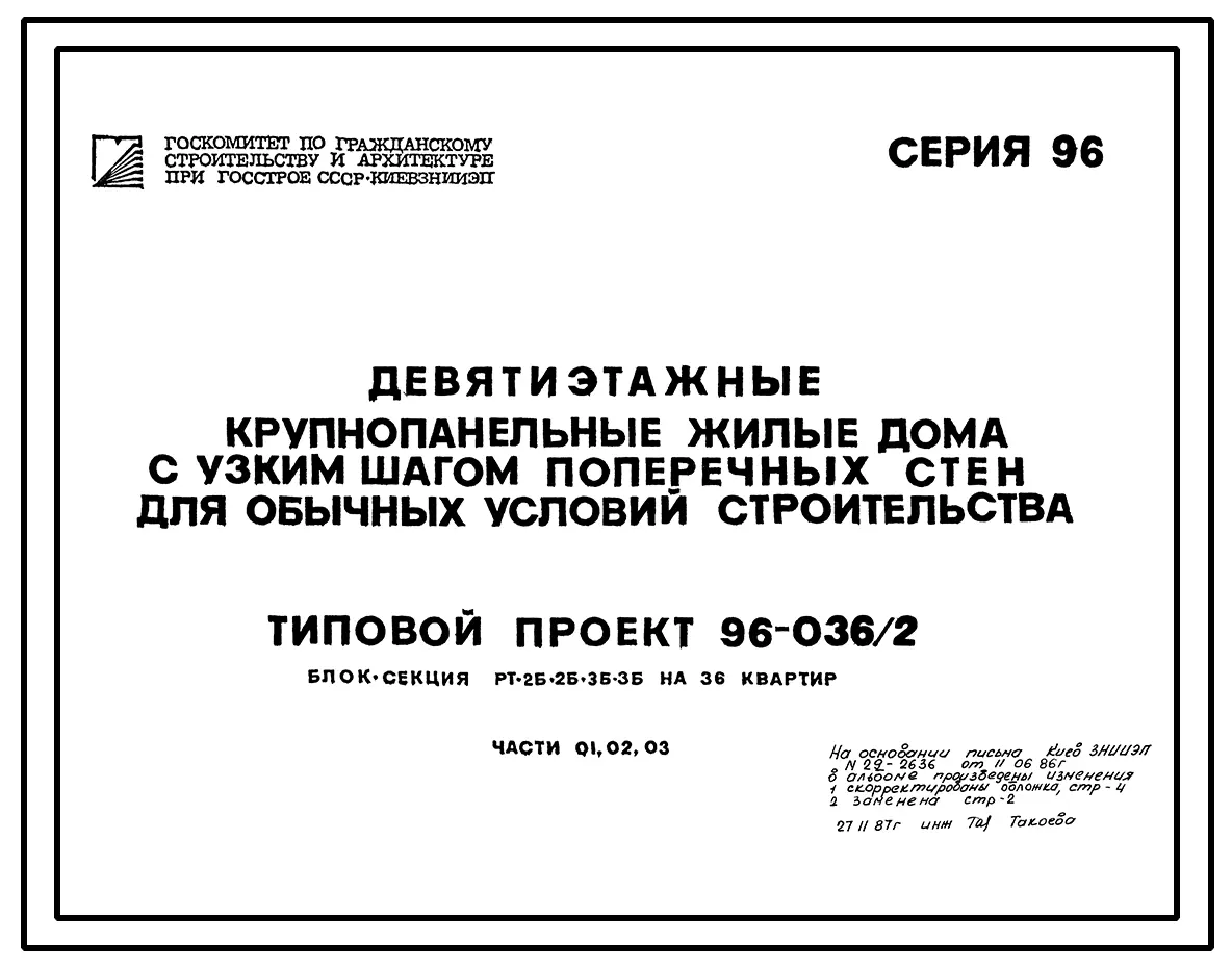 Типовой проект 96-036.2 Блок-секция рядовая 9-этажная 36-квартирная 2Б-2Б-3Б-3Б