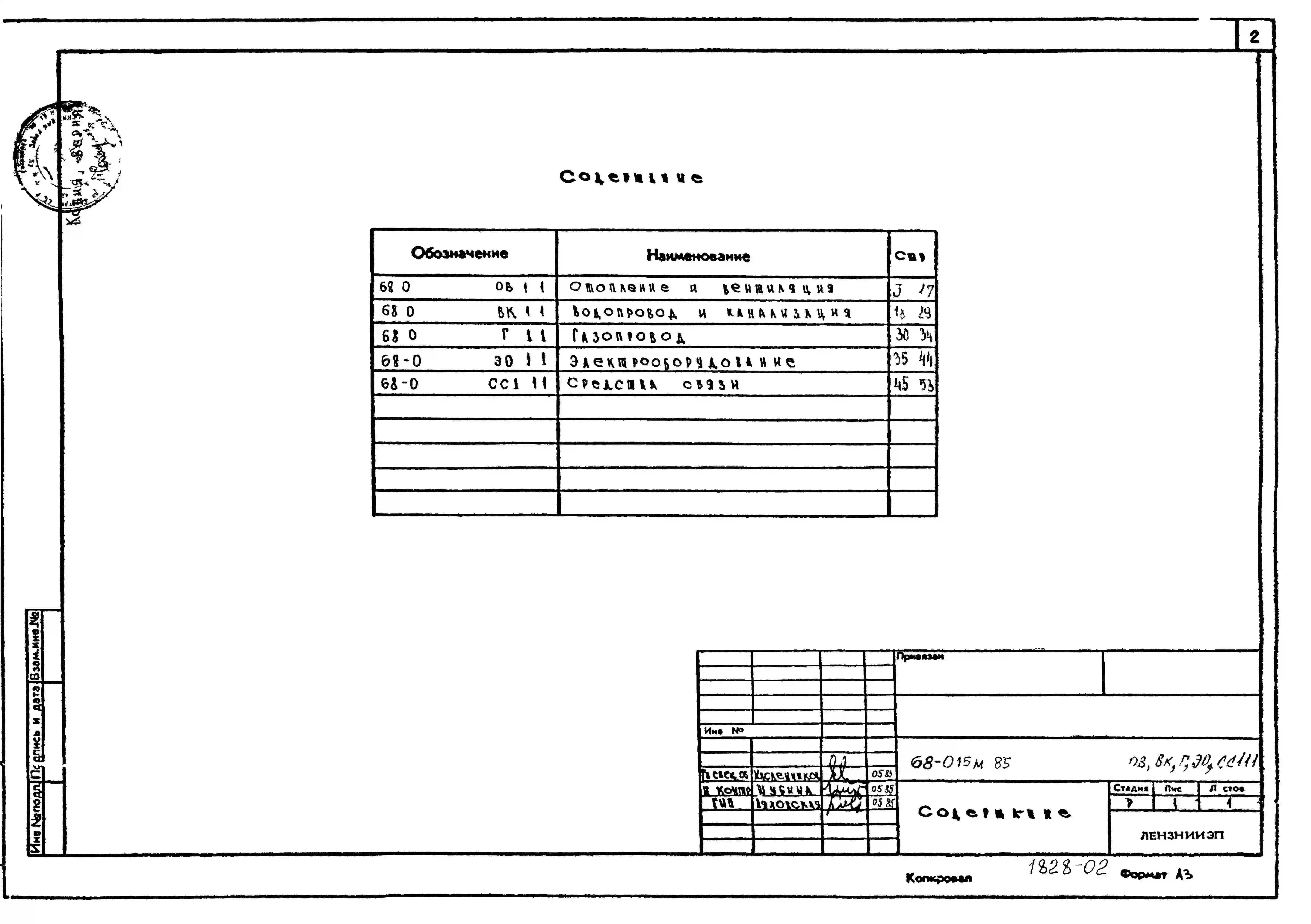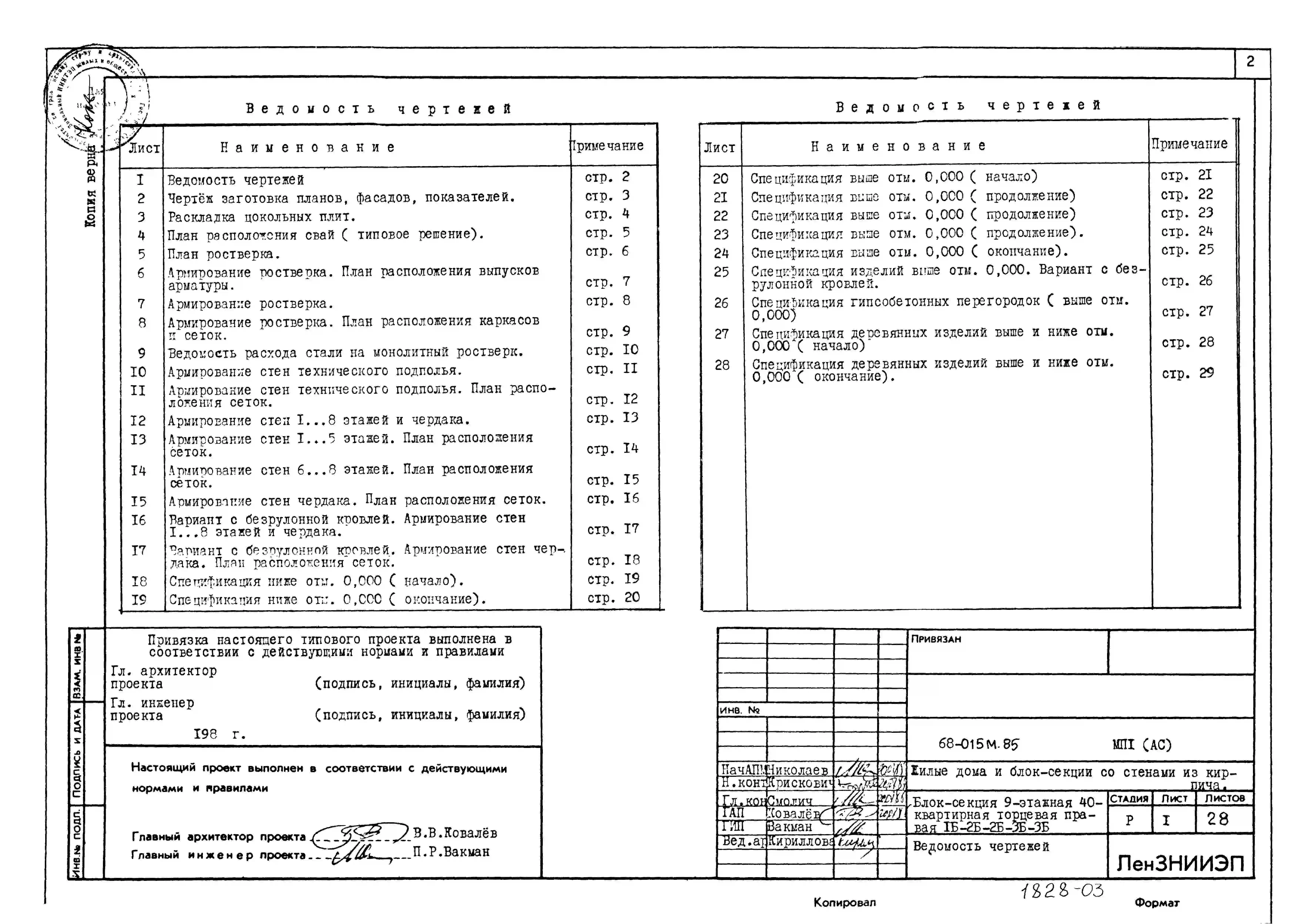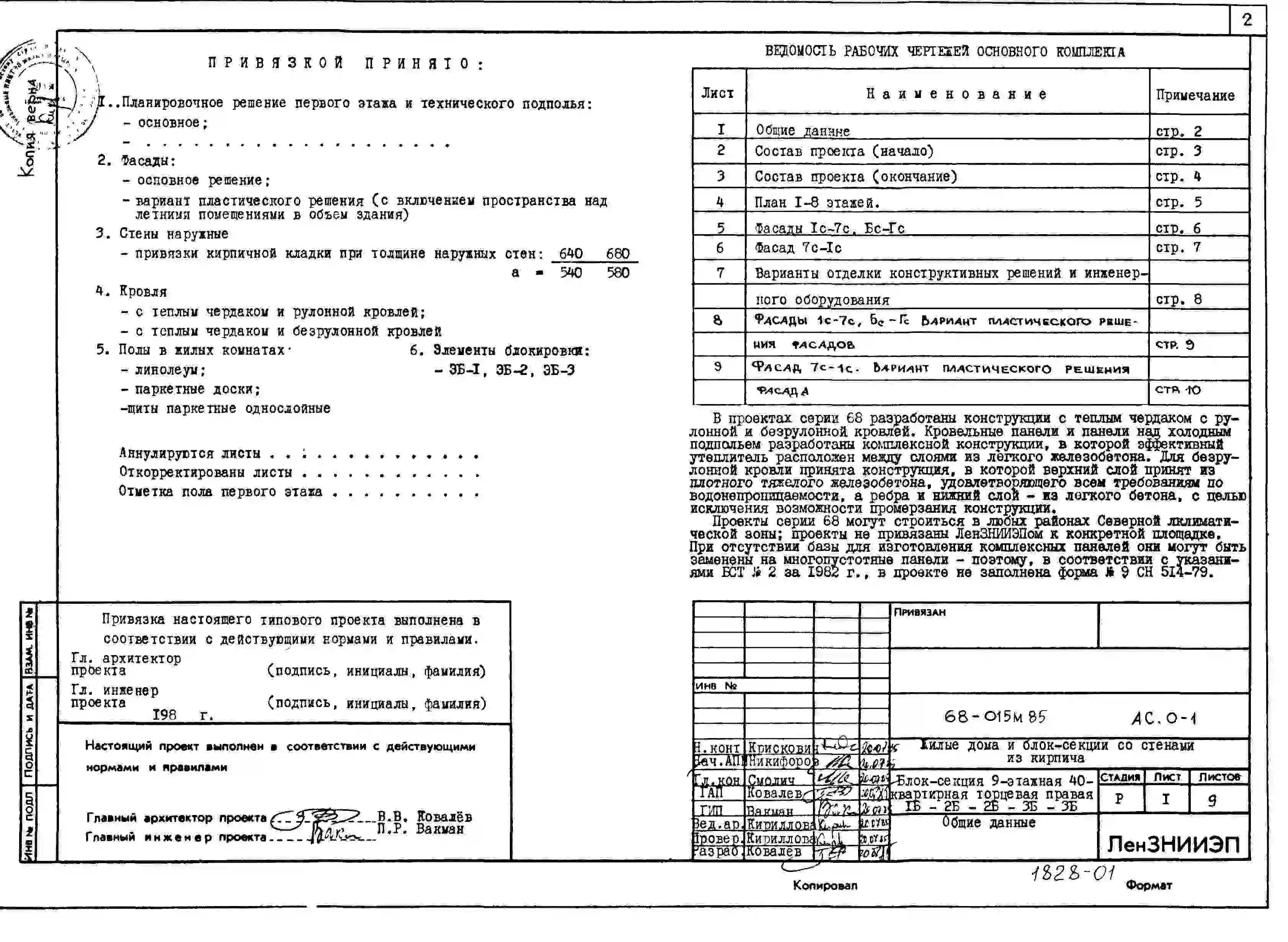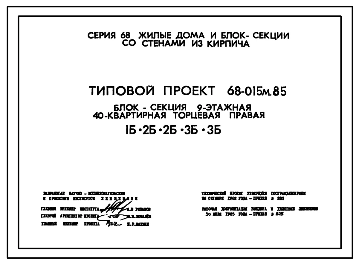 Типовой проект 68-015м.85 Девятиэтажная блок-секция торцевая правая на 40 квартир. Паспорт проекта (формат PDF) Чертежи (формат TIF)