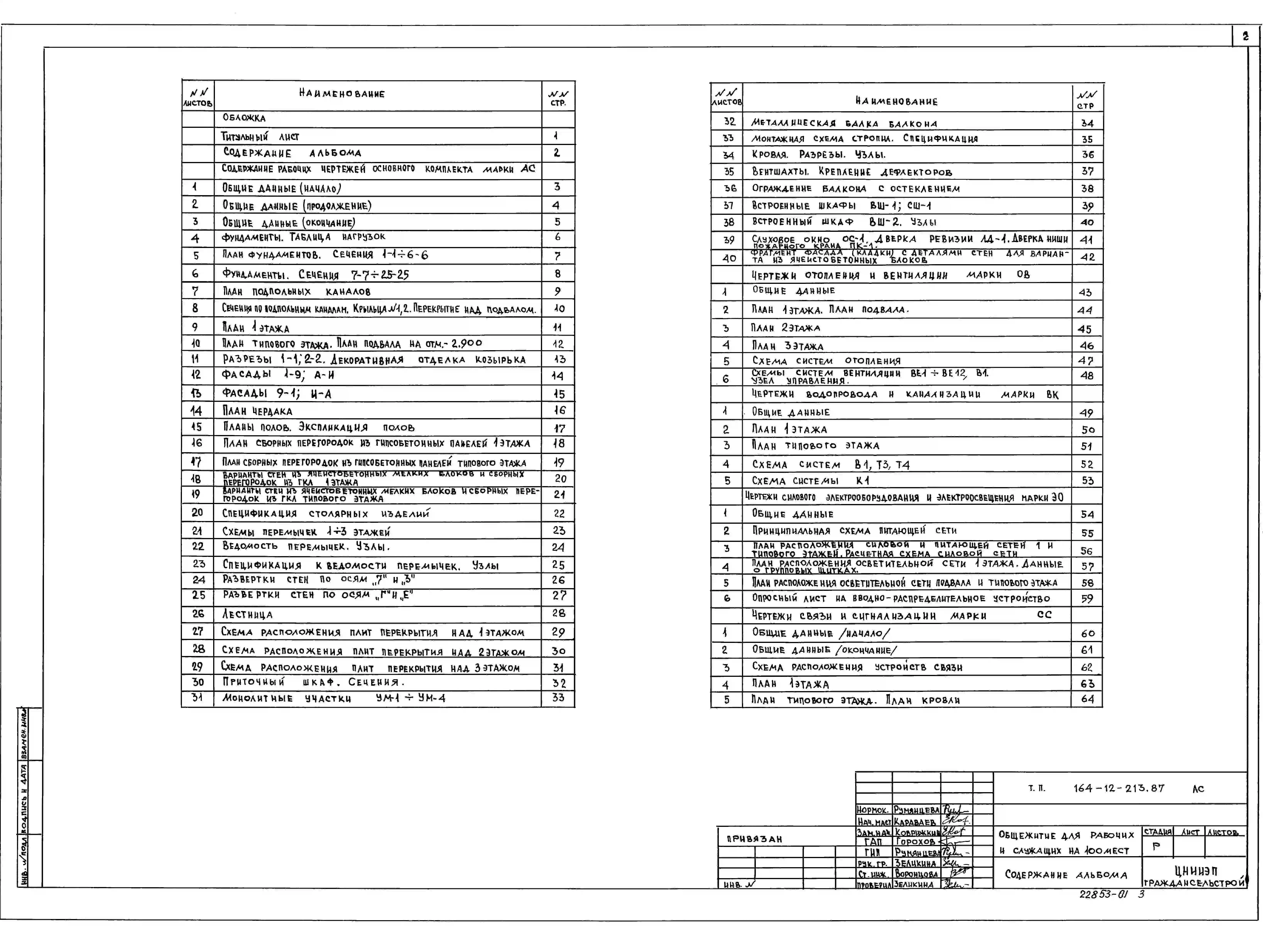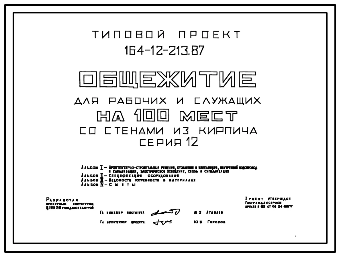 Типовой проект 164-12-213.87 Общежитие на 100 мест для рабочих и служащих (с комнатами на 2 и 3 чел.). Стены из кирпича. Общая площадь 1442 м2