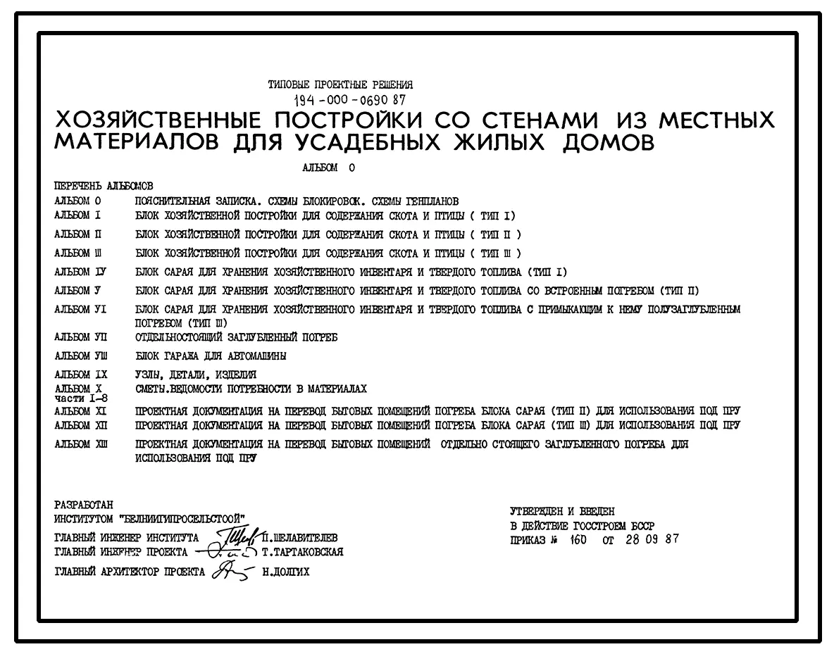 Типовой проект 194-000-690.87 Хозяйственные постройки со стенами из местных материалов для усадебных жилых домов