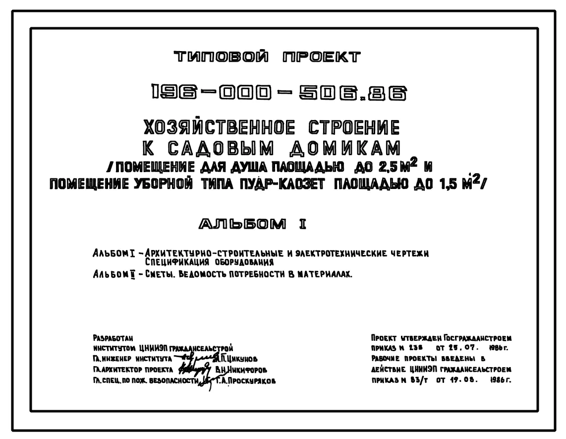 Типовой проект 196-000-506.86 Хозяйственное строение (помещение для душа площадью до 2,5 м2 и уборной типа пудр-клозет площадью до 1,5 м2). Общая площадь 5,8 м2 (СТЕНЫ ДЕРЕВЯННЫЕ КАРКАСНЫЕ, Хозяйственные строения)