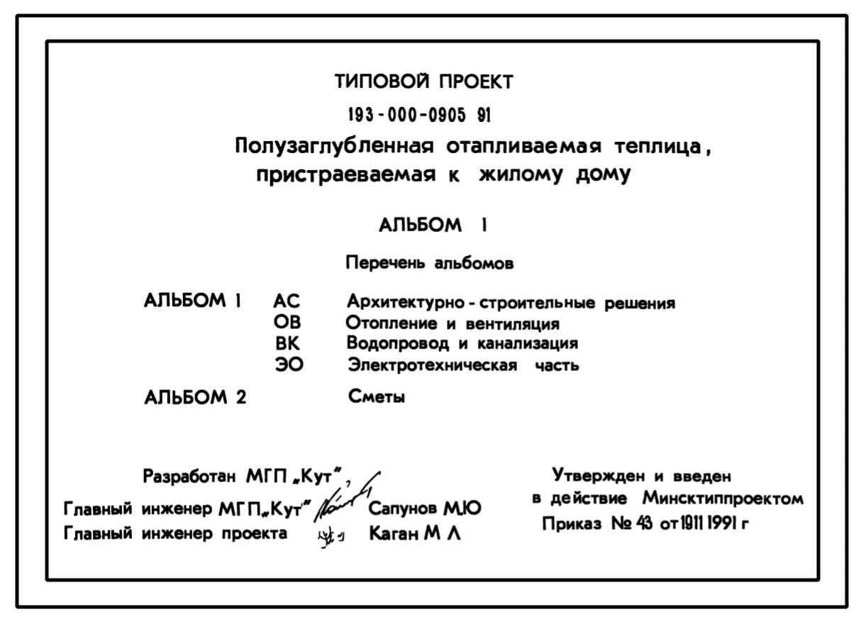 Типовой проект 193-000-0905.91 Полузаглубленная отапливаемая теплица, пристраиваемая к жилому дому