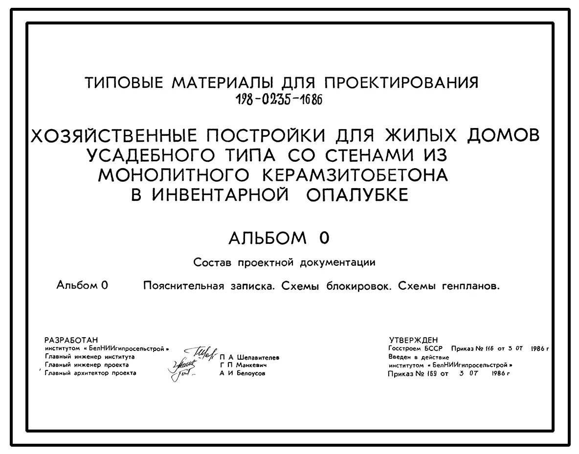 Типовой проект 198-0235-16.86 Хозяйственные постройки для жилых домов усадебного типа со стенами из монолитного керамзитобетона в инвентарной опалубке. Для индивидуального строительства в сельской местности