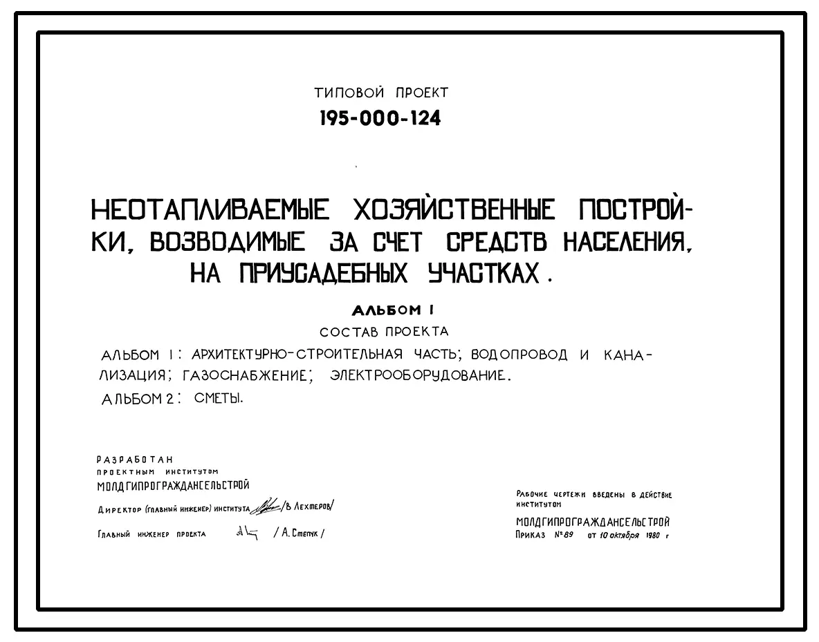 Типовой проект 195-000-124 Неотапливаемые хозяйственные постройки, возводимые за счет средств населения на приусадебных участках. Для строительства в 3Б климатическом подрайоне Молдавской ССР