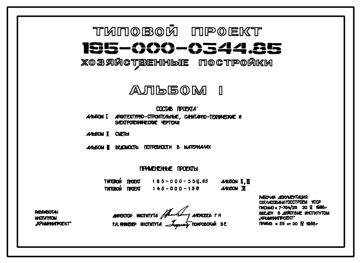 Типовой проект 195-000-0344.85 Хозяйственные постройки с помещениями для содержания скота и птицы, гараж, тип 1,2,3. Стены из мелкоштучного камня известняка-ракушечника. Паспорт проекта (формат PDF) Чертежи (формат TIF)