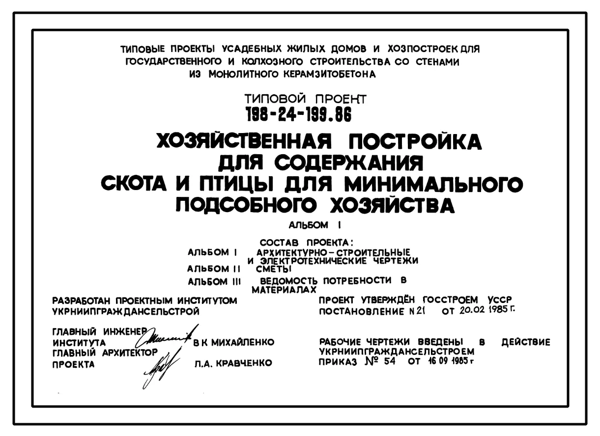 Типовой проект 198-24-199.86 Хозяйственная постройка для содержания скота и птицы для минимального подсобного хозяйства для государственного и колхозного строительства