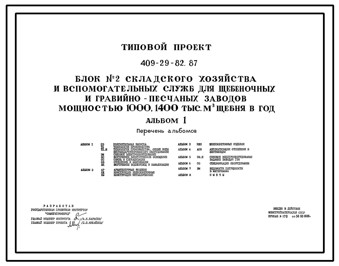 Типовой проект 409-29-82.87 Блок № 2 складского хозяйства и вспомогательных служб для щебеночных и гравийно-песчаных заводов мощностью 1000, 1400 тыс. м3 щебня в год