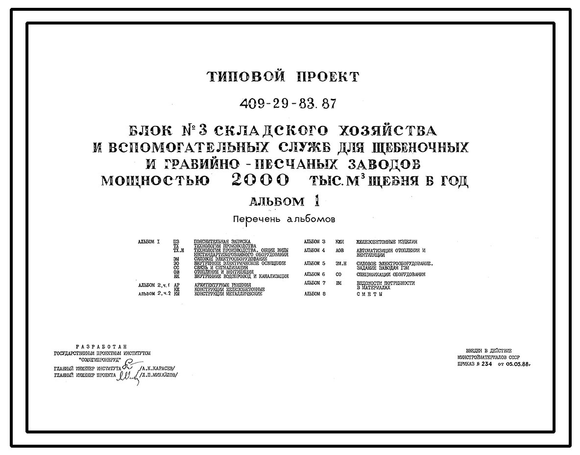 Типовой проект 409-29-83.87 Блок складского хозяйства и вспомогательных служб для щебеночных и гравийно-песчаных заводов мощностью 2000 тыс. м3 щебня в год