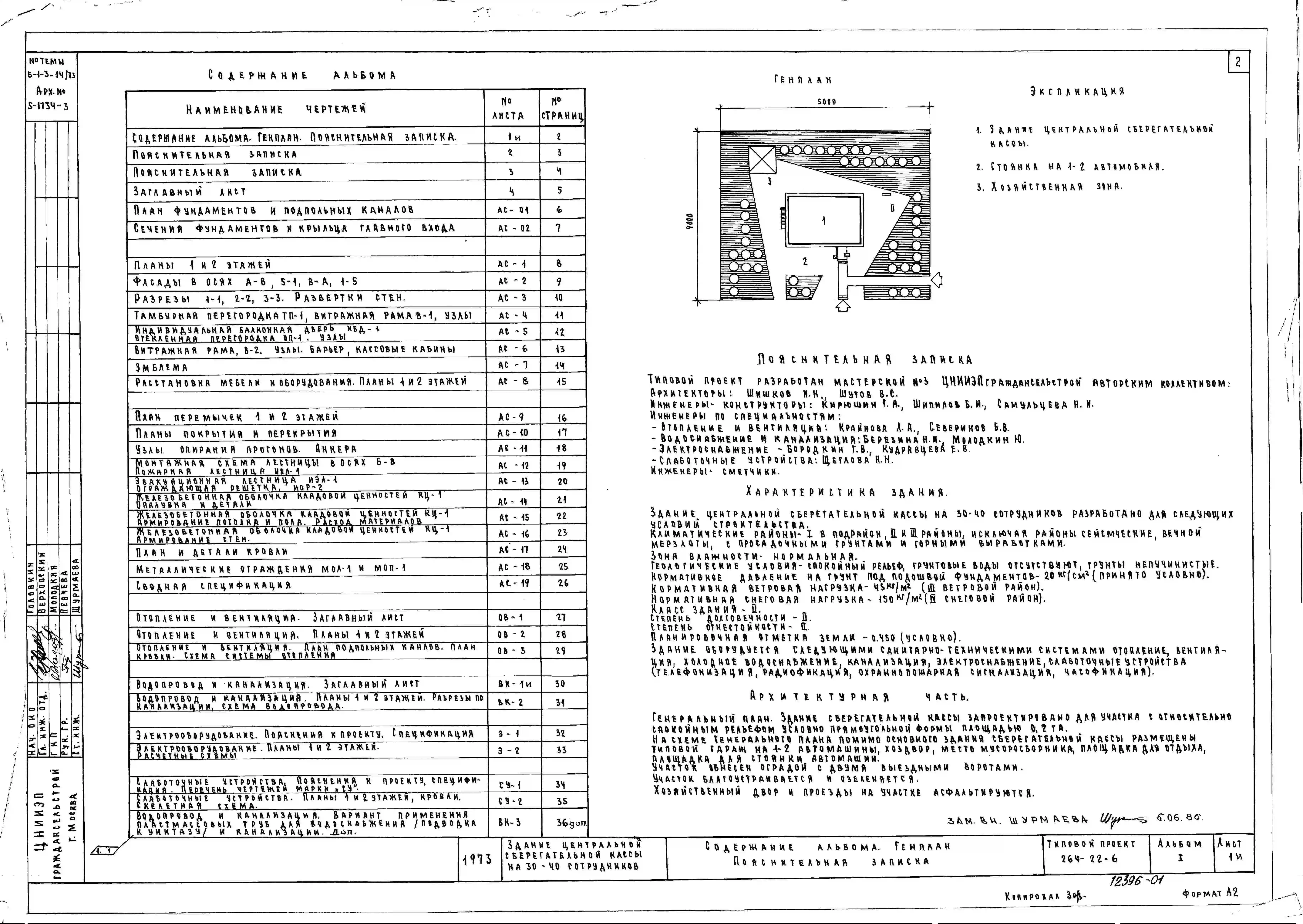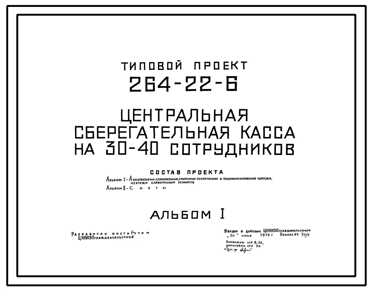 Типовой проект 264-22-6 Центральная сберегательная касса на 30-40 сотрудников для строительства в 1В климатическом подрайоне, 2 и 3 климатических районах