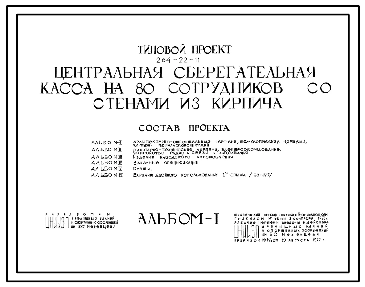 Типовой проект 264-22-11 Центральная сберегательная касса на 80 сотрудников со стенами из кирпича. Для строительства в IВ климатическом подрайоне, II и III климатических районах.