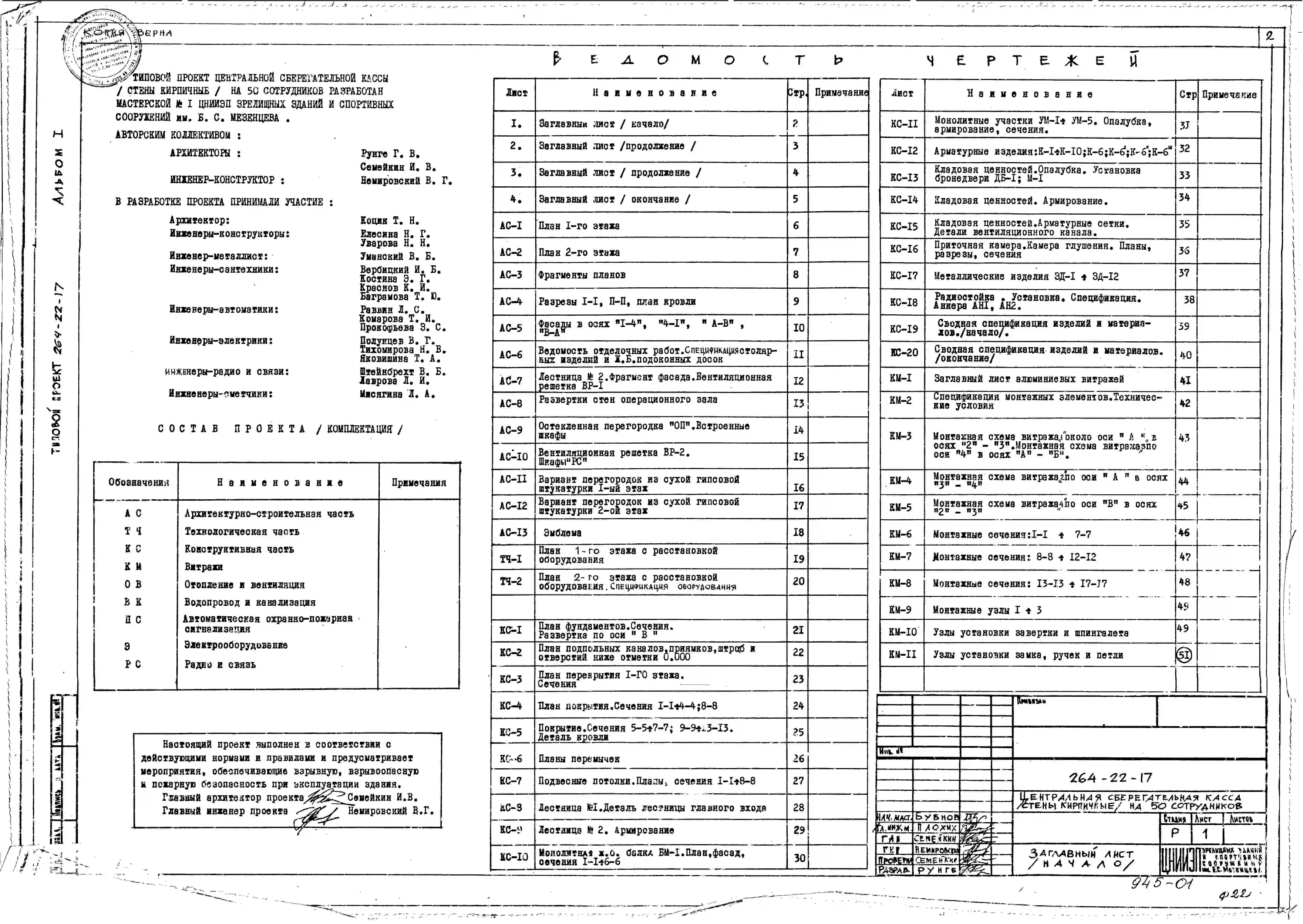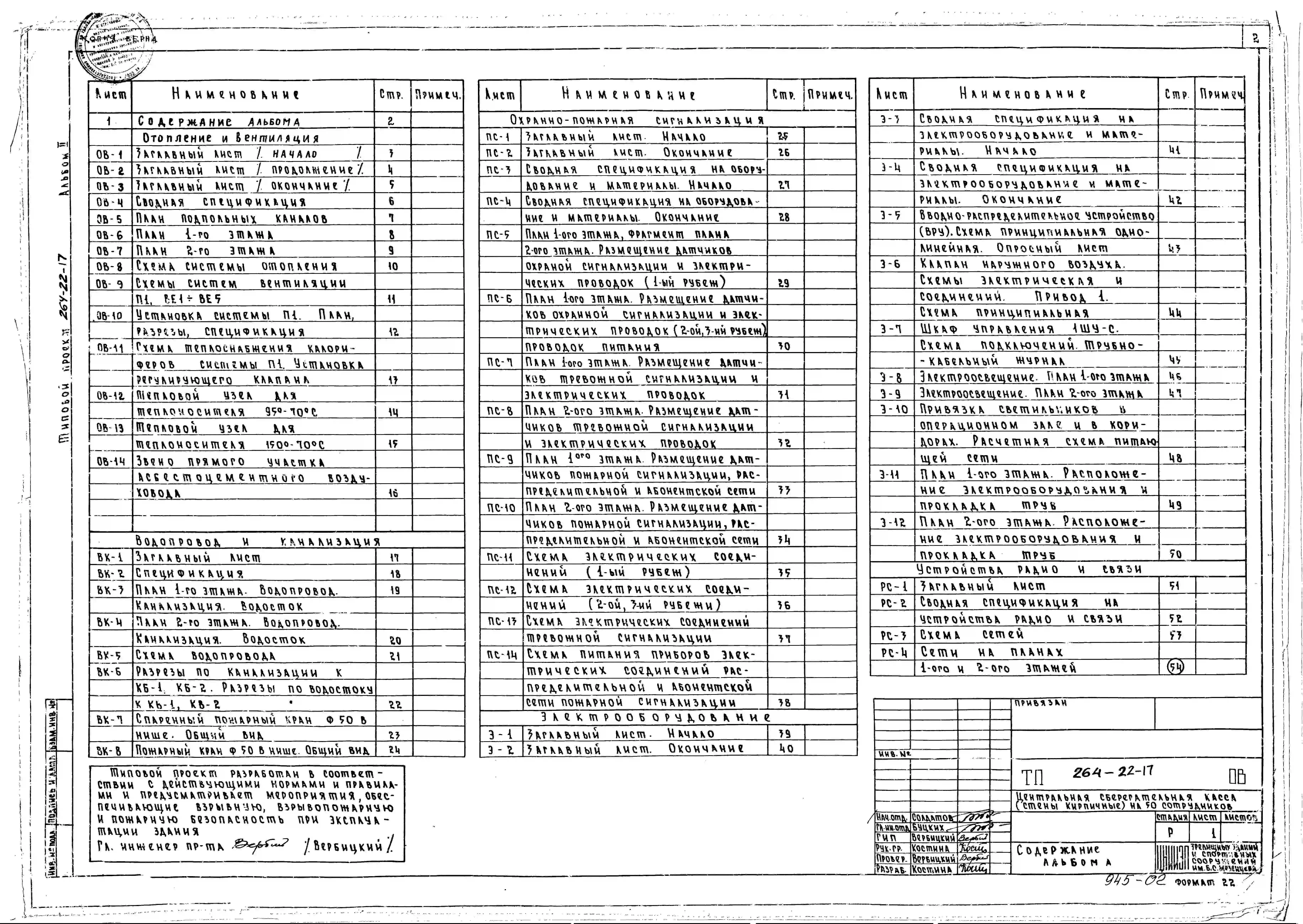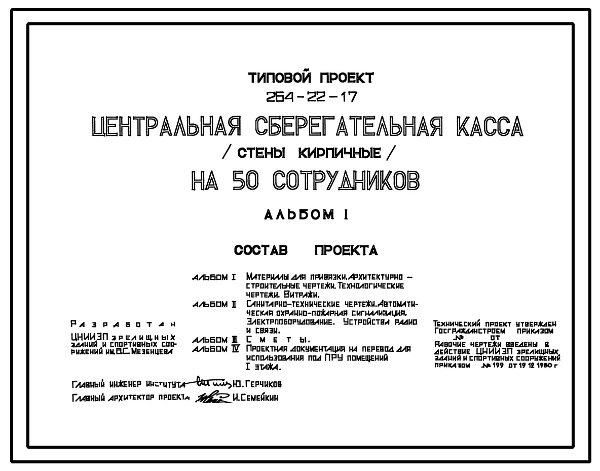 Типовой проект 264-22-17 Центральная сберегательная касса на 50 сотрудников. Стены кирпичные. Для строительства в 1В климатическом подрайоне, 2 и 3 климатических районах