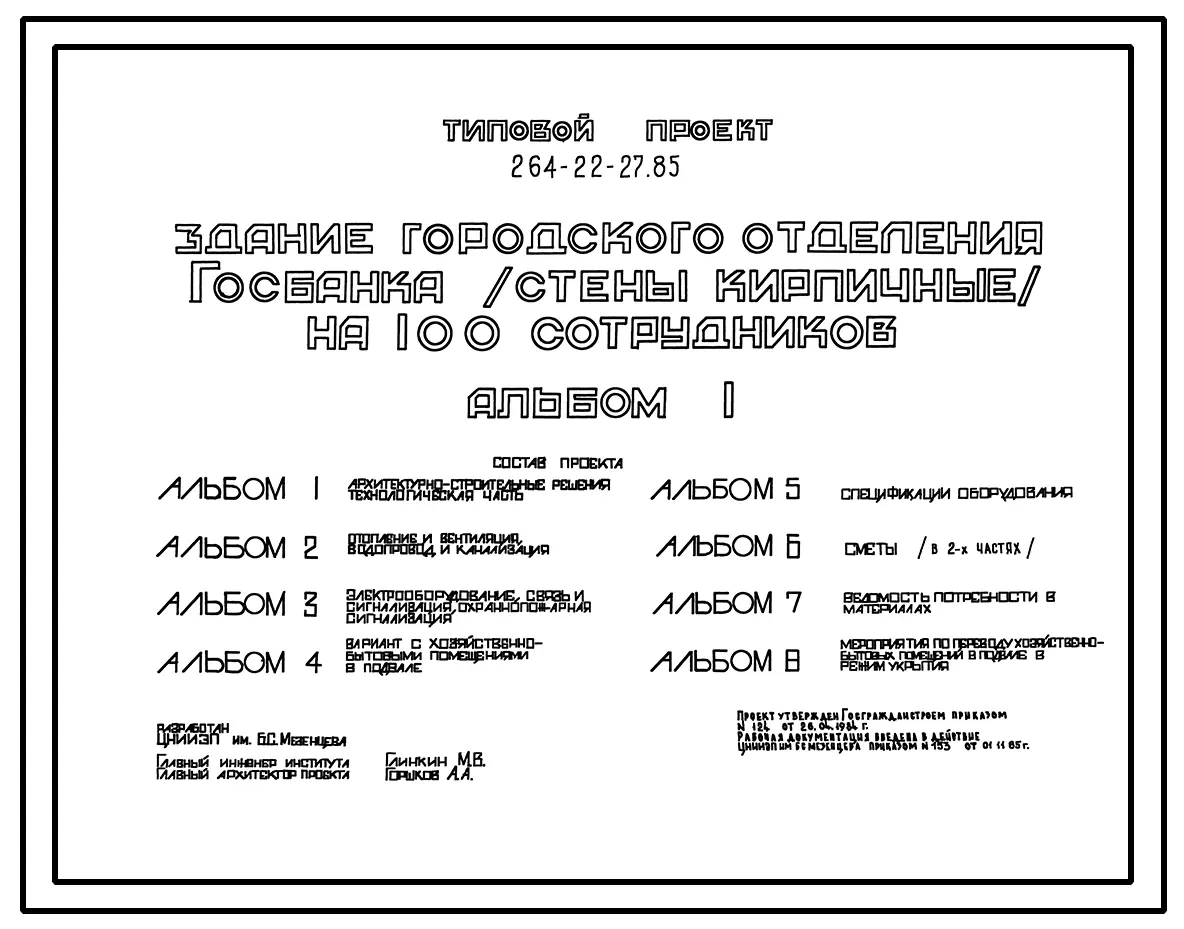 Типовой проект 264-22-27.85 Здание городского отделения госбанка на 100 сотрудников. Стены кирпичные. Для сельского строительства