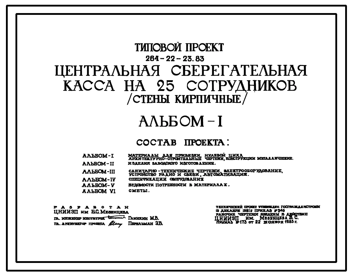 Типовой проект 264-22-23.83 Центральная сберегательная касса на 25 сотрудников (стены кирпичные). Для строительства во 2 и 3 климатических районах.