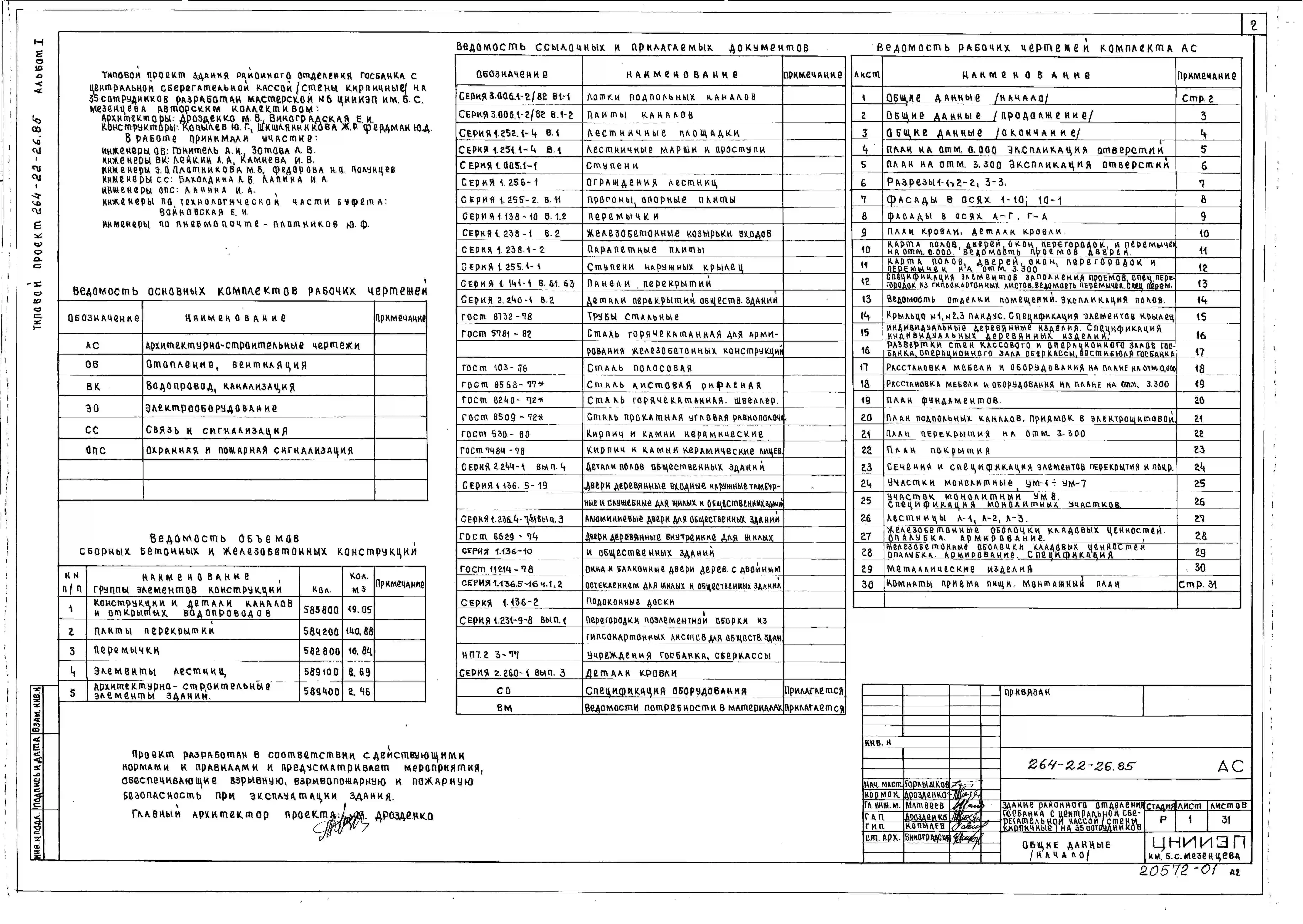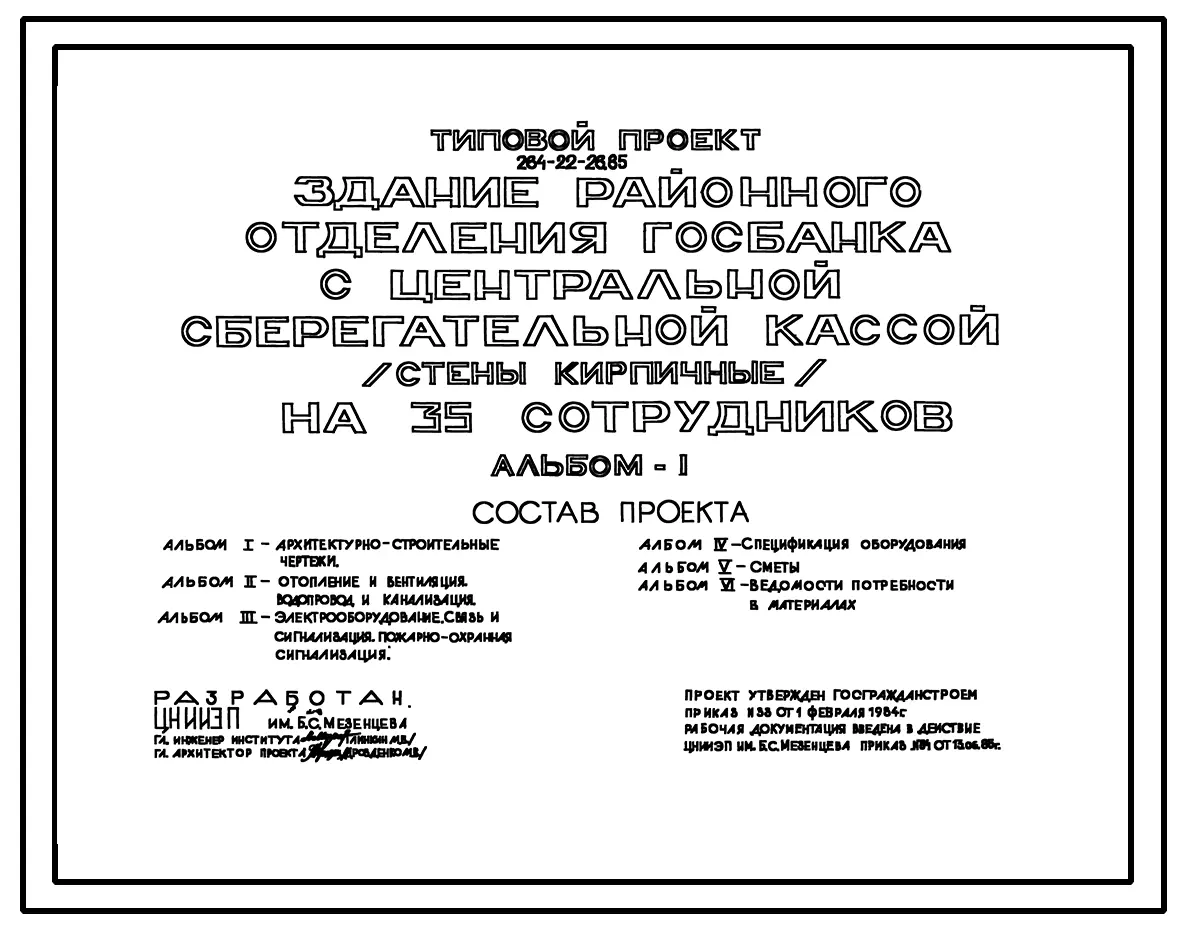 Типовой проект 264-22-26.85 Здание районного отделения Госбанка с центральной сберегательной кассой на 35 сотрудников. Для строительства в 1В климатическом подрайоне, 2 и 3 климатических районах