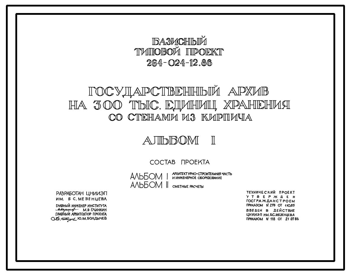 Типовой проект 264-024-12.86 Государственный архив на 300 тыс. единиц хранения со стенами из кирпича. Для строительства в городах и поселках городского типа