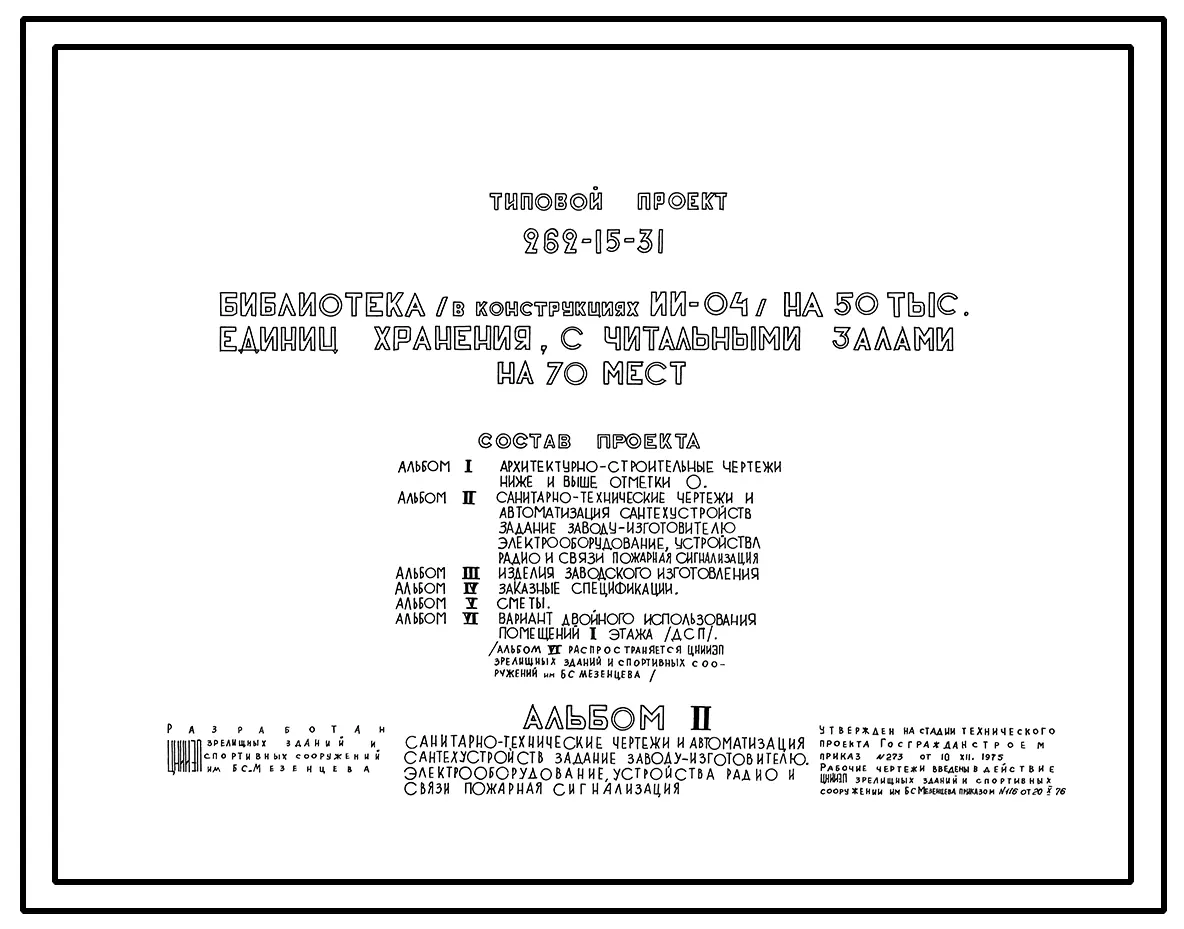 Типовой проект 262-15-31 Библиотека (в конструкциях ИИ-04) на 50 000 единиц хранения, с читальными залами на 70 мест. Для строительства в IВ климатическом подрайоне, II и III климатических районах.