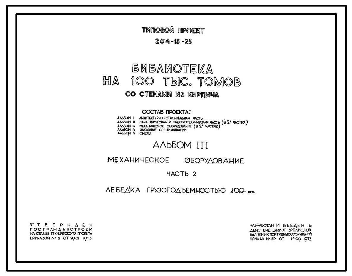 Типовой проект 264-15-23 Библиотека на 100 тысяч томов для строительства в 1В климатическом подрайоне 2 и 3 климатических районах