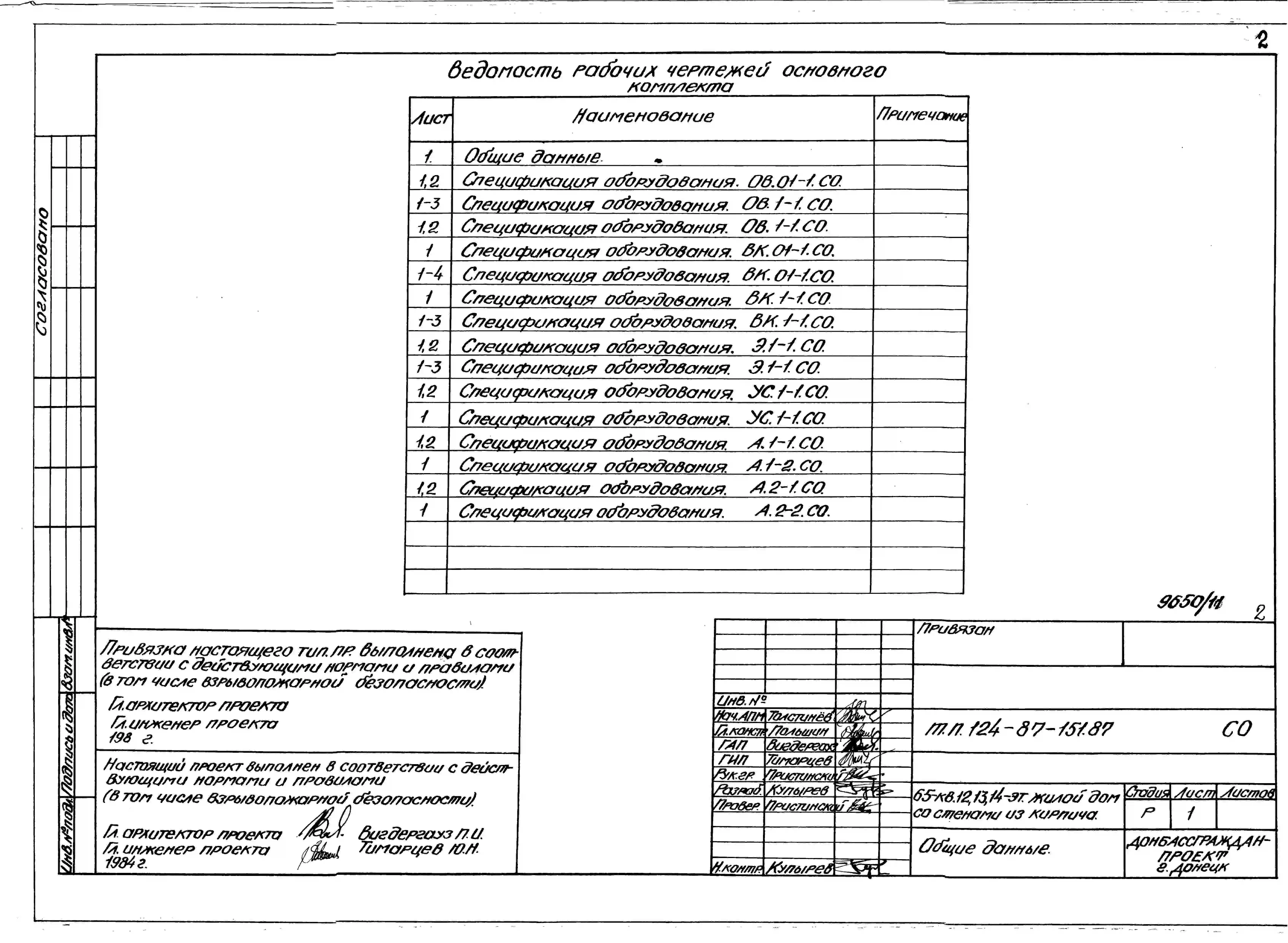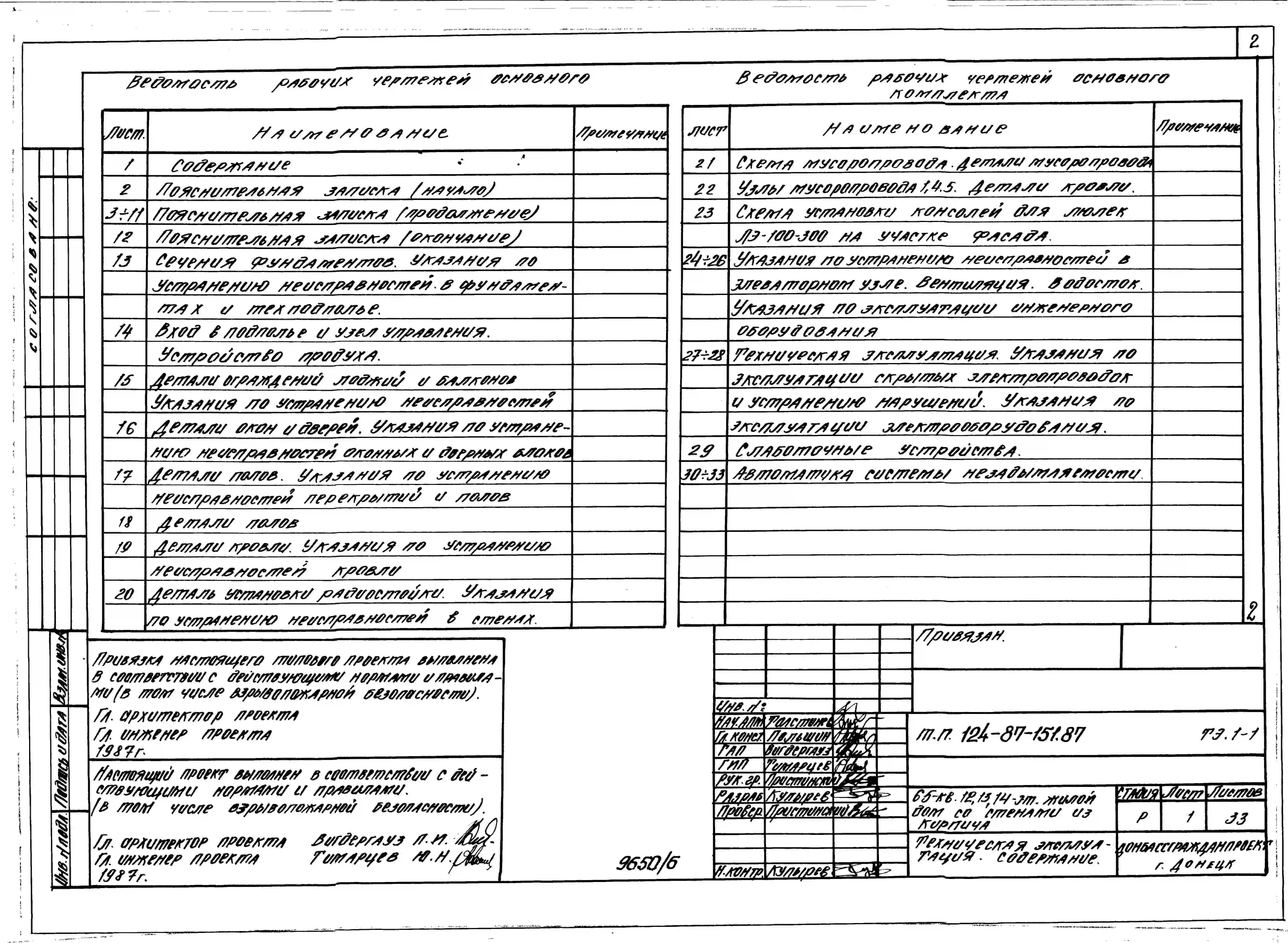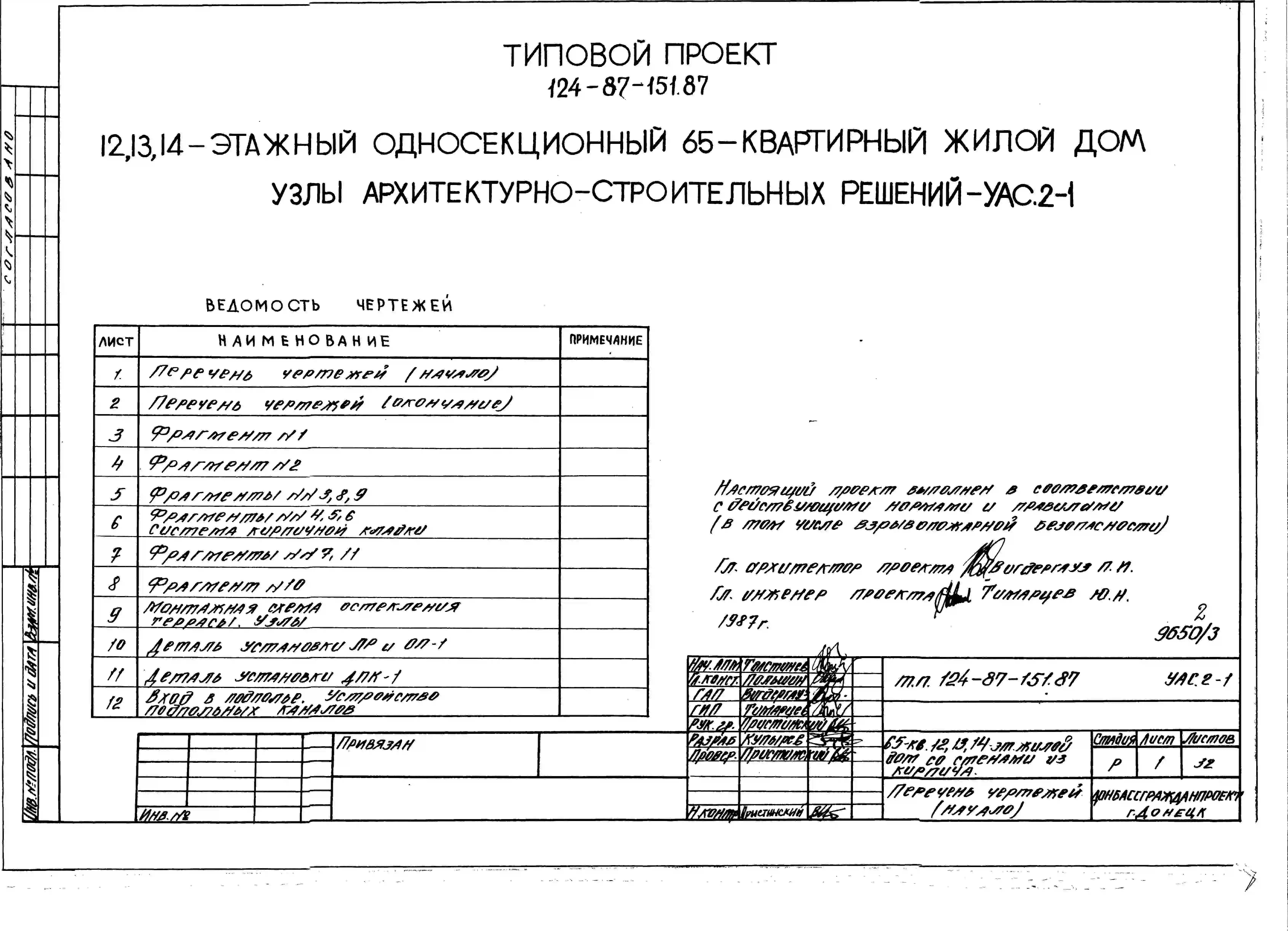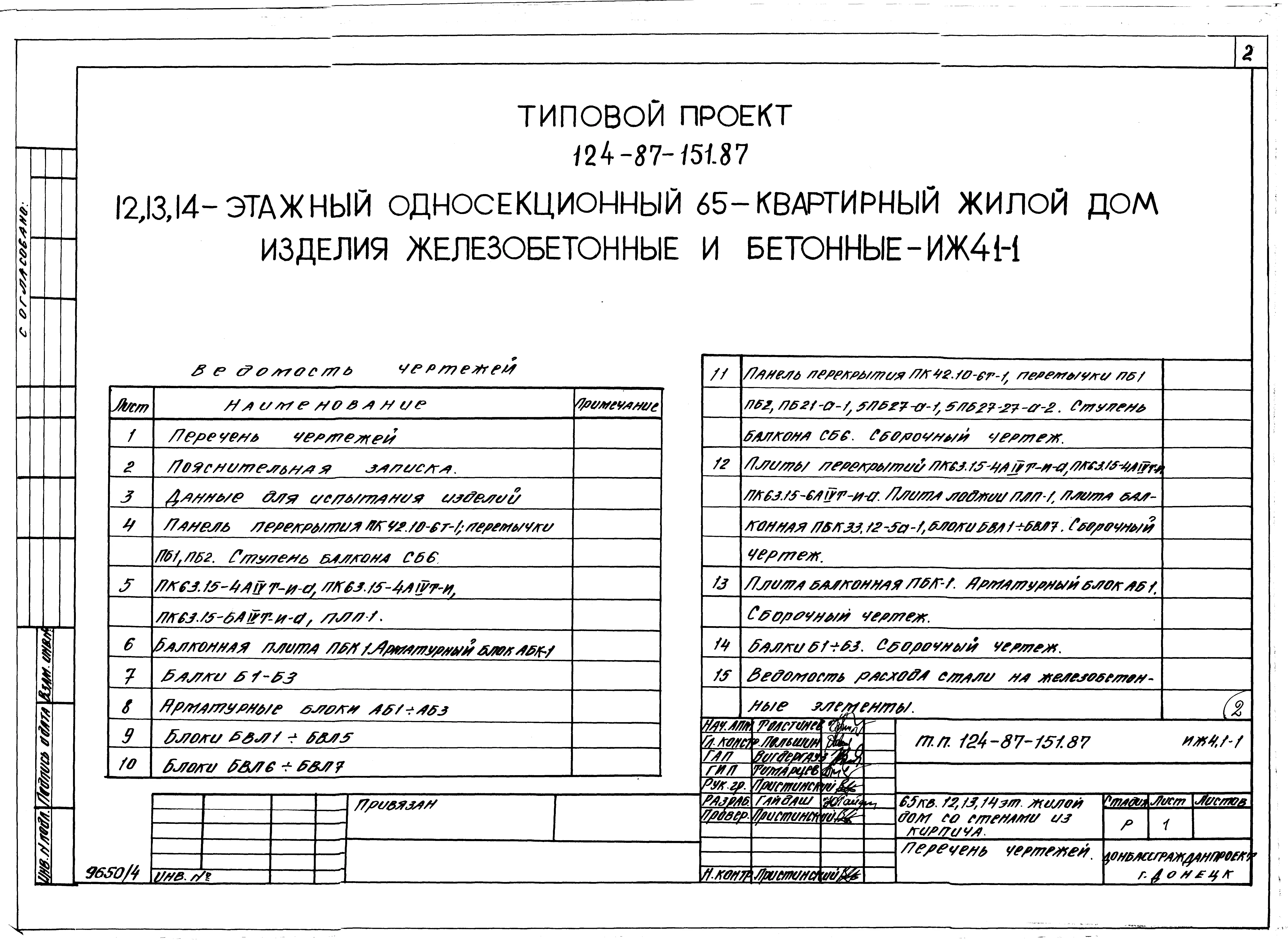 Типовой проект 124-87-151.87 65-квартирный 12, 13, 14-этажный жилой дом со стенами из кирпича. Паспорт проекта (формат PDF) Чертежи (формат TIF)