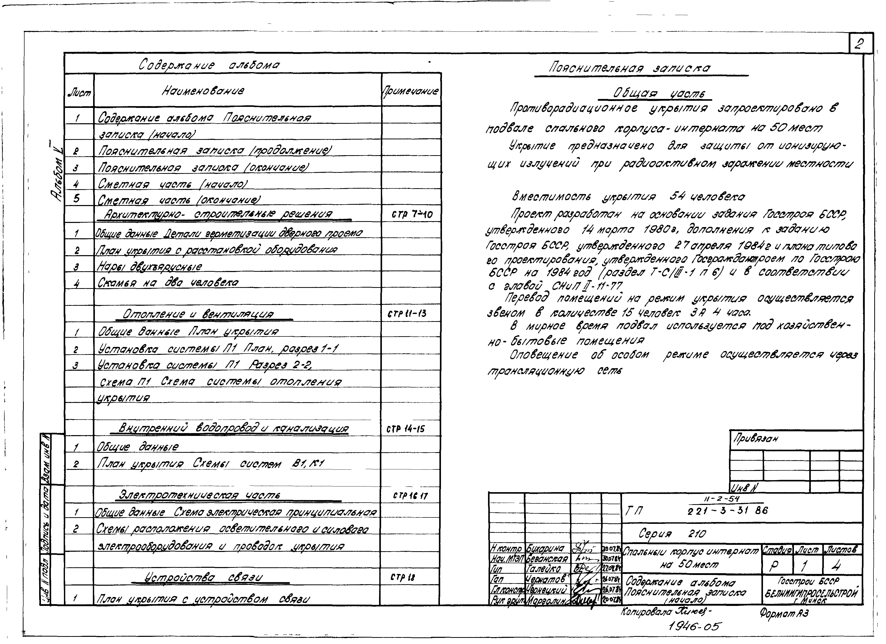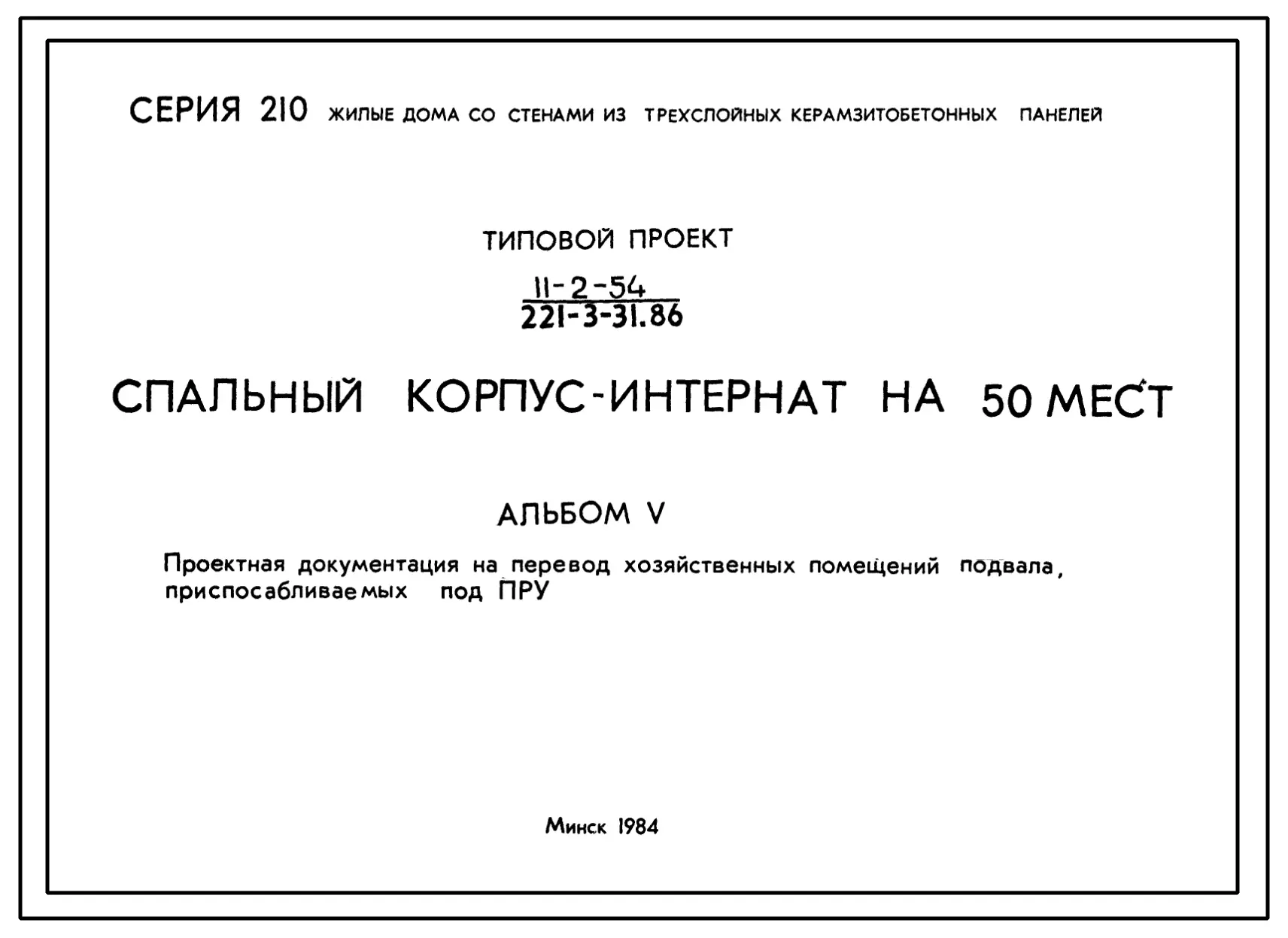 Типовой проект П-2-54(221-3-31.86) Хозяйственные помещения подвала спального корпуса-интерната на 50 мест, (убежище на 54 человек, размеры убежища 14,4м на 13,2м, режимы вентиляции 1,2,3).. Чертежи (формат TIF) Паспорт проекта