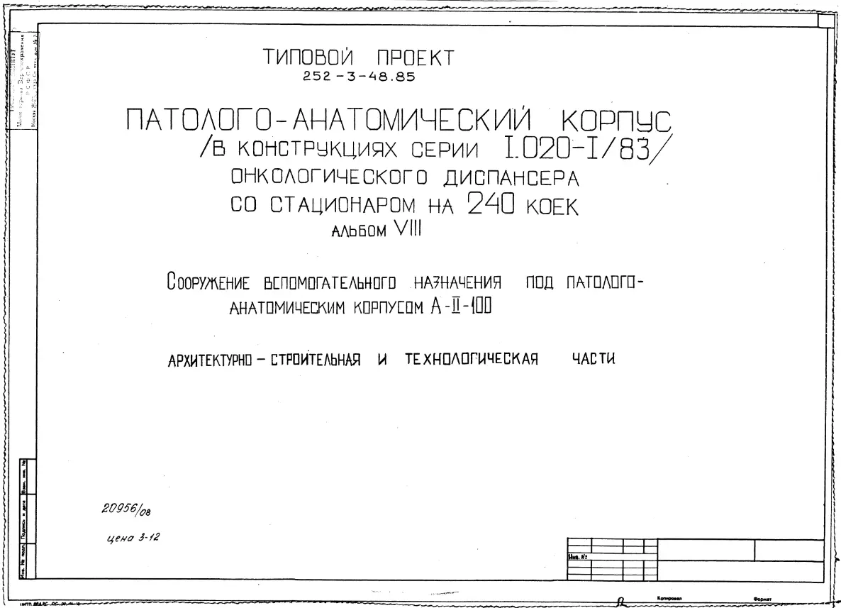 Типовой проект A-II-100 252-3-48.85 Сооружение вспомогательного назначения под патологоанатомическим корпусом онкологического диспансера со стационаром на 240 коек. Конструкции железобетонные сборно-монолитные по серии У-01-01/80 (для сух. Паспорт проекта Чертежи (формат TIF)