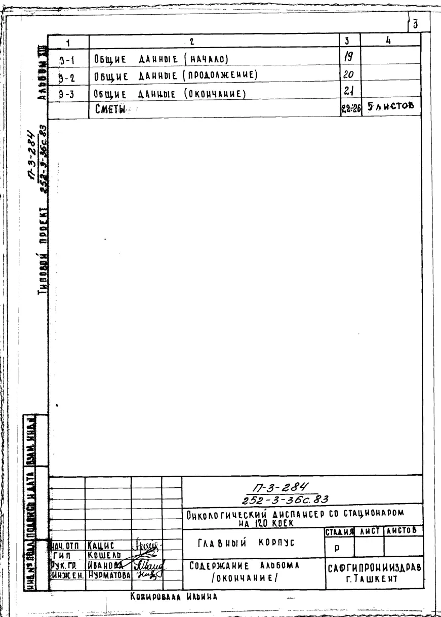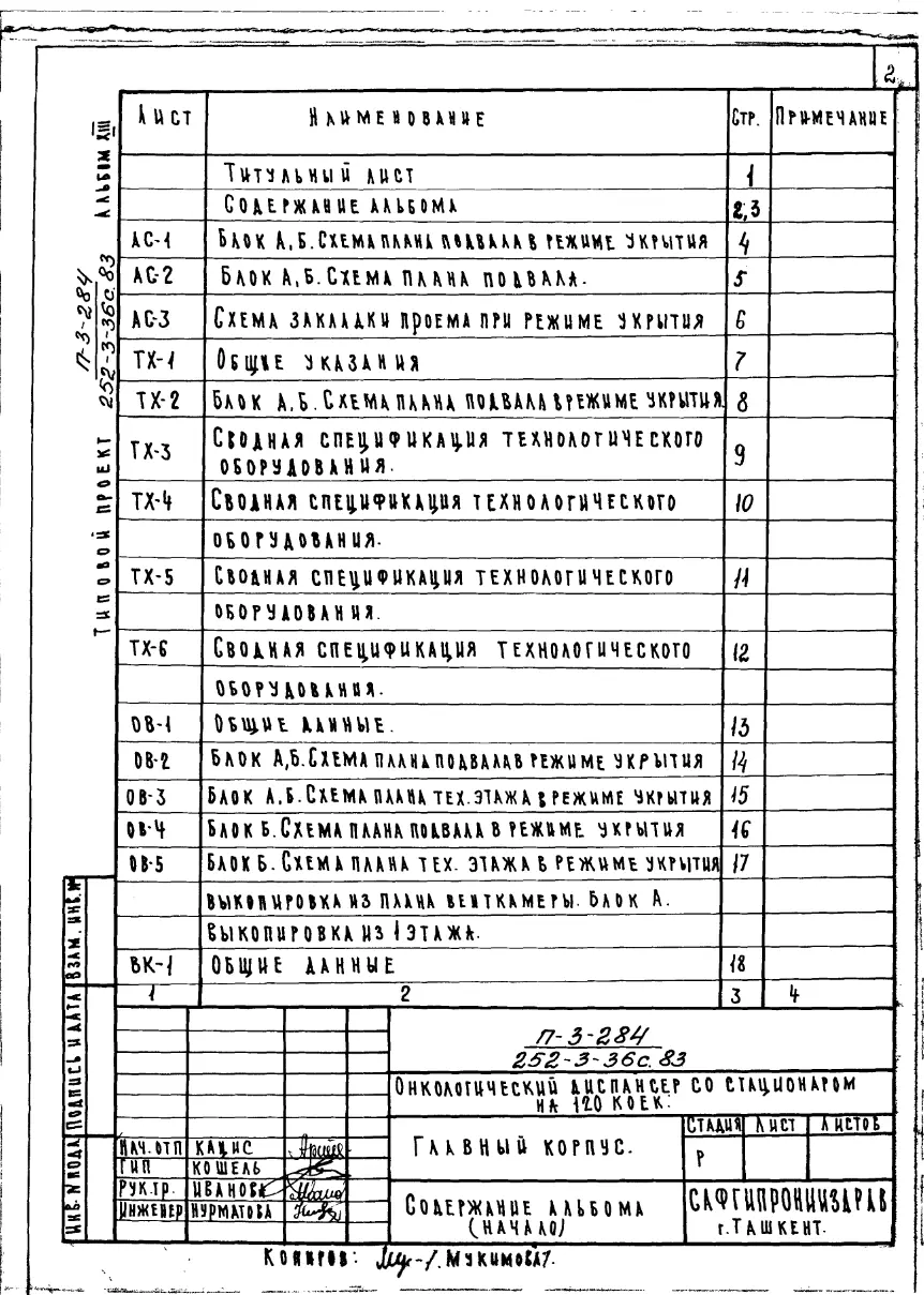 Типовой проект П-3-284(252-3-36с.83) Хозяйственно-бытовые помещения, в подвале главного корпуса онкологического диспансера со стационаром на 120 коек (в конструкциях ИИС-04), (убежище на 284 человек, размеры убежища 48м на 36м, режимы вентиляции 1,2).. Паспорт проекта Чертежи (формат TIF)