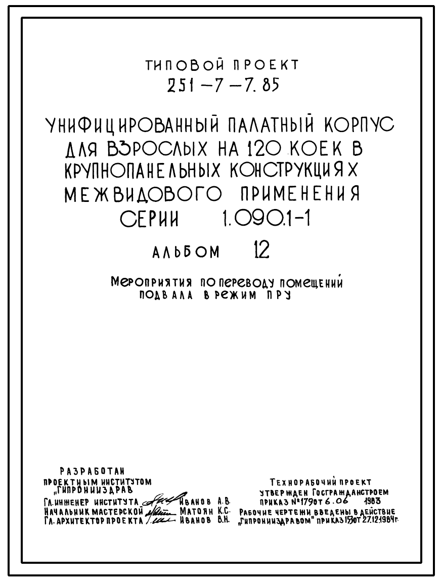Типовой проект П-3-185(251-7-7.85) Хозяйственно-бытовые помещения в подвале унифицированного палатного корпуса для взрослых на 120 коек в крупнопанельных конструкциях межвидового применения серии 1.090.1-1, (убежище на 185 человек, режимы вентиляции 1,2).. Паспорт проекта Чертежи (формат TIF)
