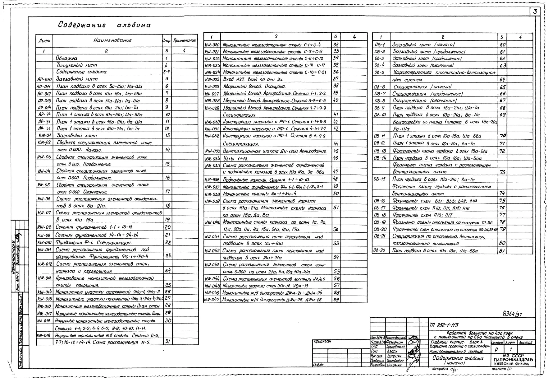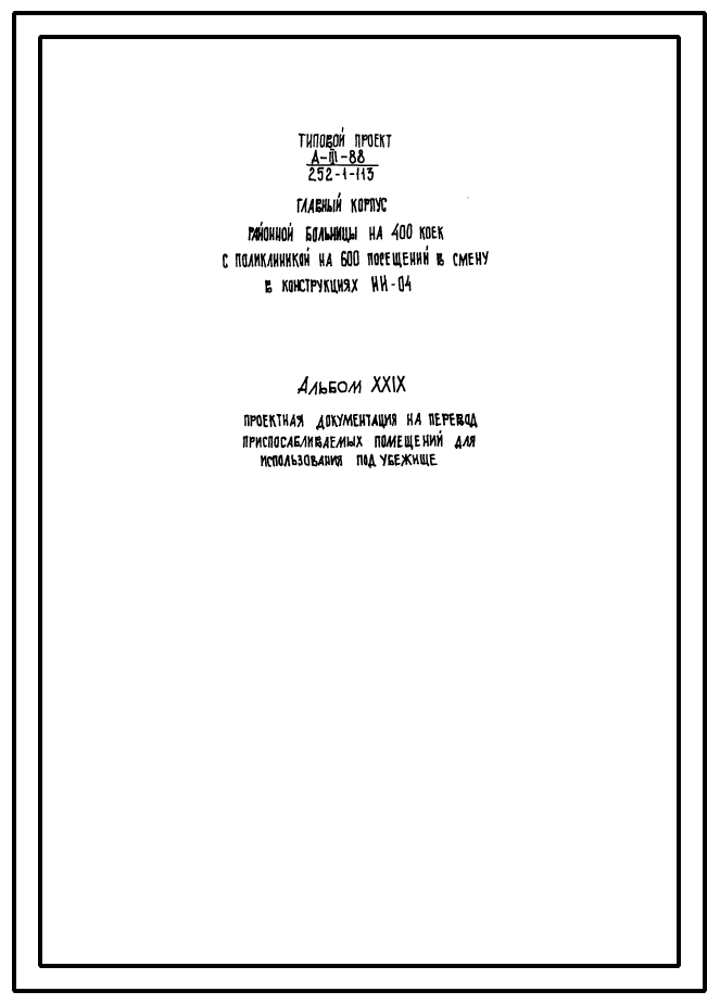 Типовой проект А-3-88(252-1-113) Хозяйственно-бытовые помещения в подвале блока А главного корпуса районной больницы на 400 коек с поликлиникой на 600 помещений в смену, (убежище на 88 человек, размеры убежища 27м на 21м, режимы вентиляции 1,2).. Чертежи (формат TIF) Паспорт проекта