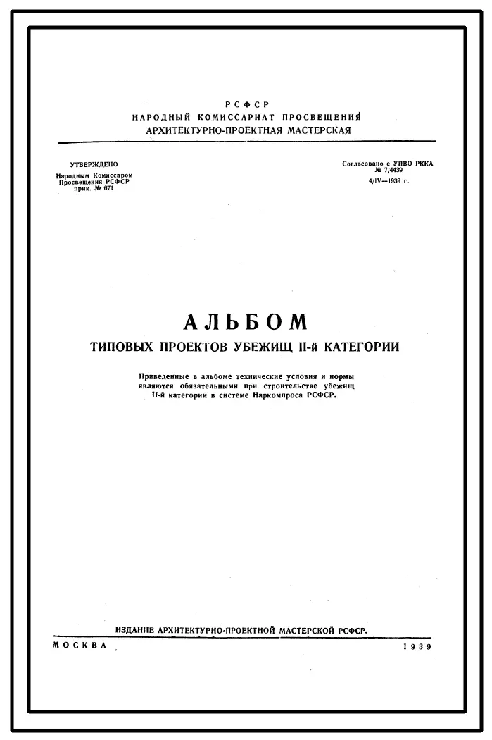 Шифр 4439 Альбом типовых проектов убежищ 2 категории для строительства убежищ в системе Наркомпроса РСФСР.