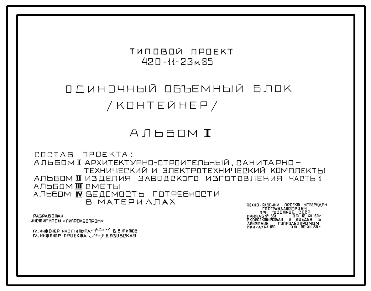 Типовой проект 420-11-23м.85 Одиночный объемный блок (контейнер). Для строительства в IА, IБ, IГ, IД климатических подрайонах на вечномерзлых грунтах (исполнение северное); IВ климатическом подрайоне, II и III,IV