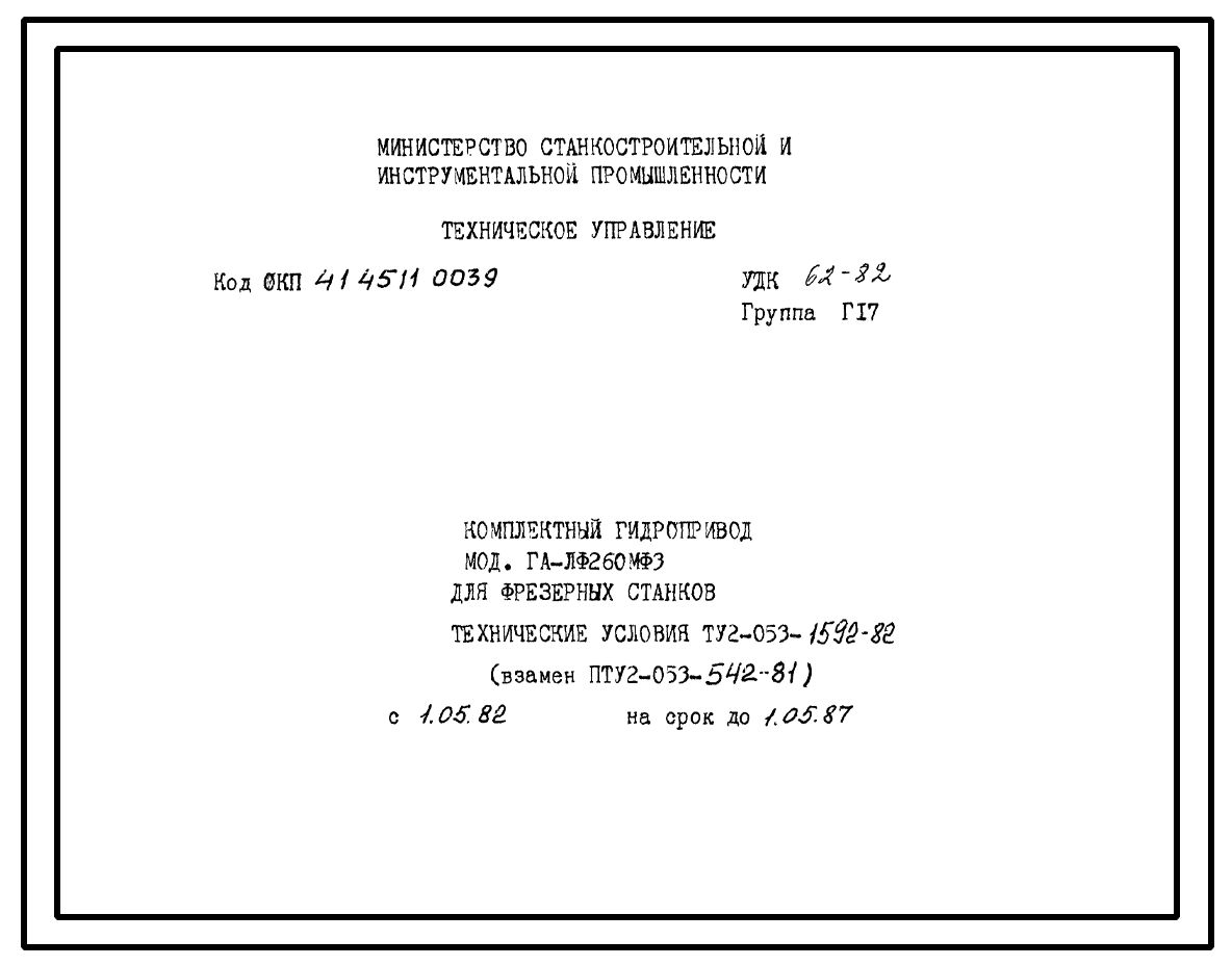 Шифр ТУ2-053-1592-82 Комплектный гидропривод типа ГА-ЛФ260МФ3