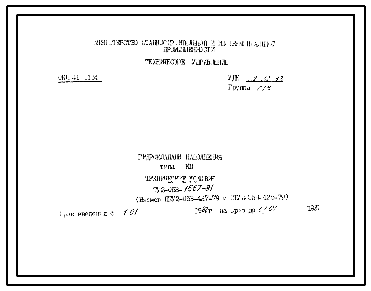 Шифр ТУ2-053-1567-81 Гидроклапаны наполнения типа КН