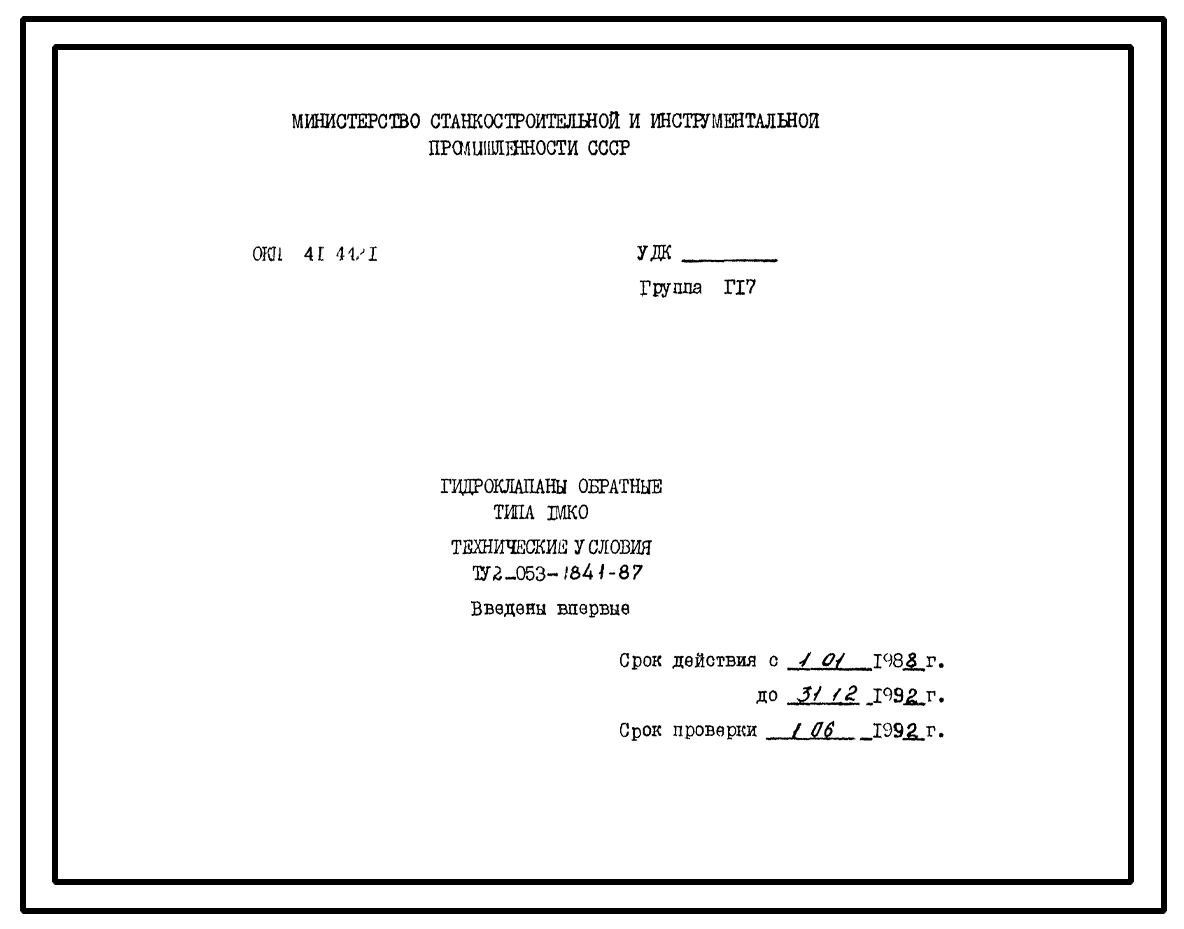 Шифр ТУ2-053-1841-87 Гидроклапаны обратные типа 1МКО