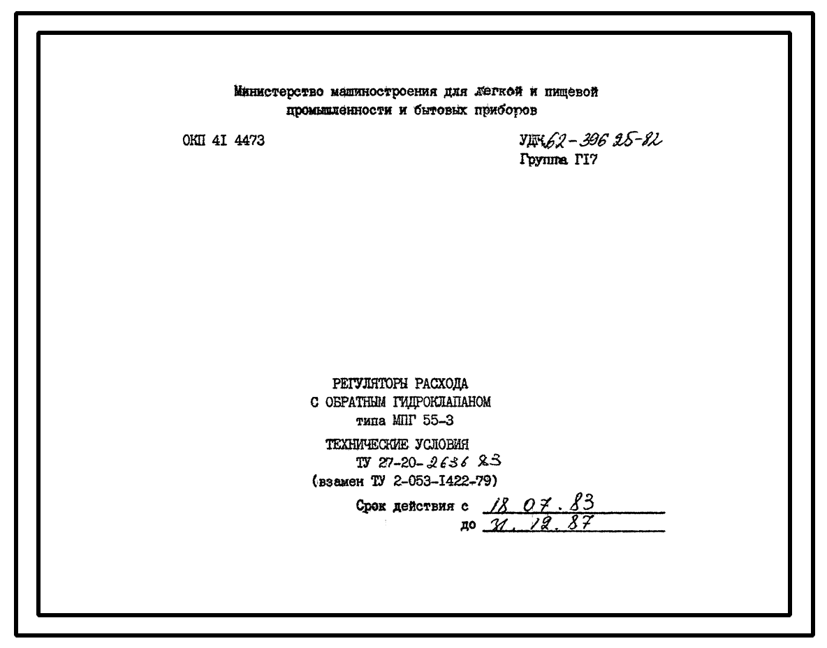 Шифр ТУ27-20-2636-83 Регуляторы расхода с обратным гидроклапаном типа МПГ 55-3