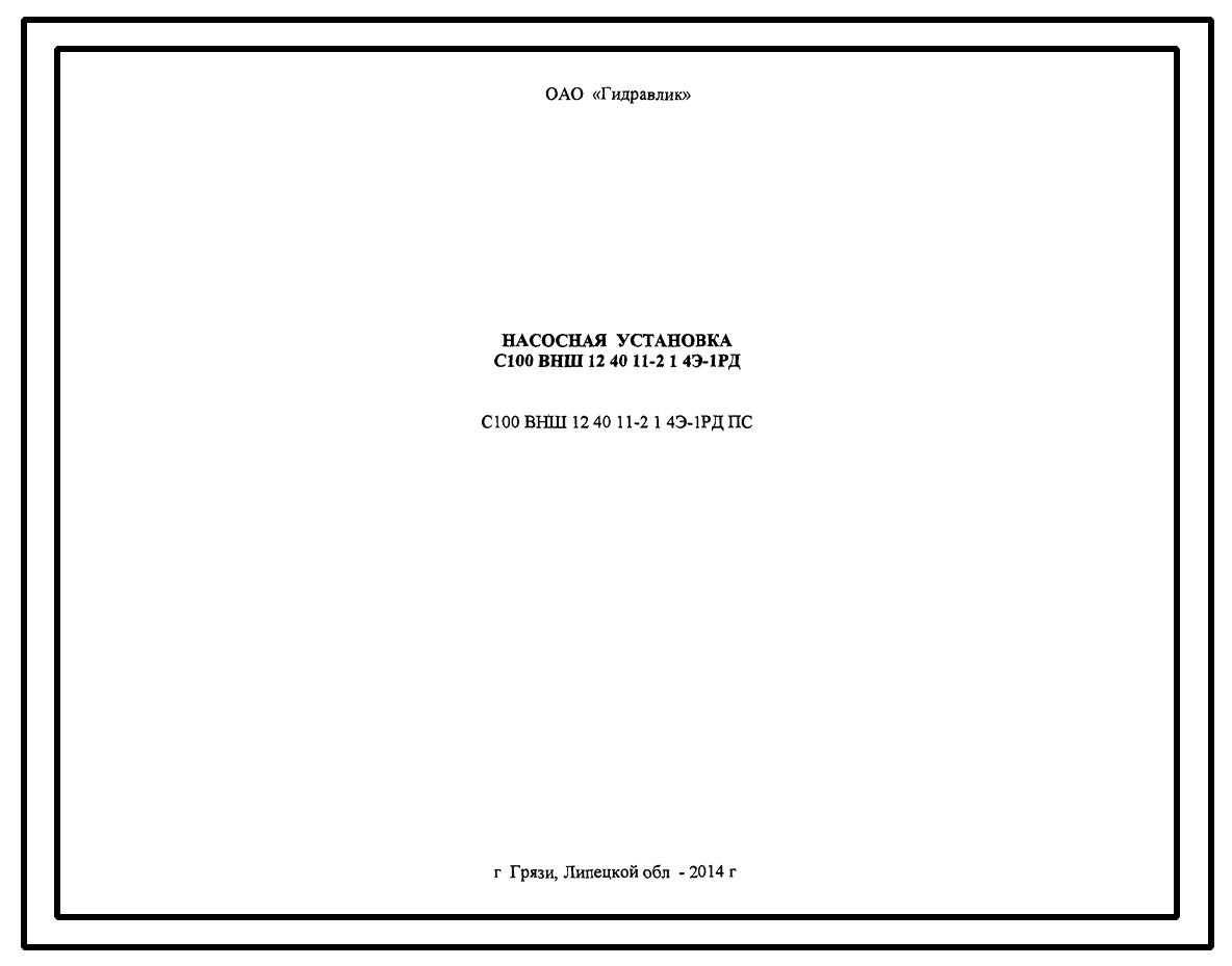 Шифр С100.ВНШ.12.40.11-2.1.4Э-1РД.ПС Насосная установка С100.ВНШ.12.40.11-2.1.4Э-1РД