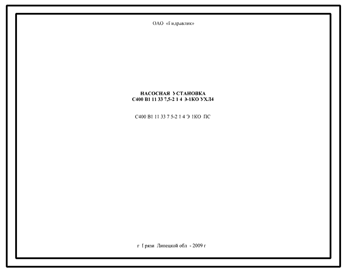 Шифр С400.В1.11.33.7,5-2.1.4.Э-1КО.ПС Насосная установка С400.В1.11.33.7,5-2.1.4.Э-1КО УХЛ4